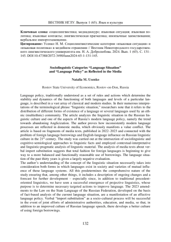 25. Щеглова И. В. Языковая ситуация: определение понятия, пути изучения // Филологические науки. Вопросы теории и практики. 2017. № 8 (74). С. 172-175. EDN: YUCHPV