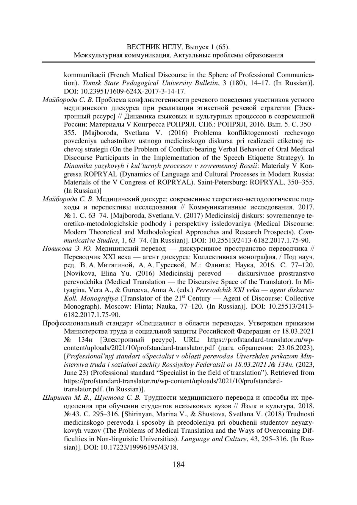 8. Ширинян М. В., Шустова С. В. Трудности медицинского перевода и способы их преодоления при обучении студентов неязыковых вузов // Язык и культура. 2018. № 43. С. 295-316. EDN: YTUQNF