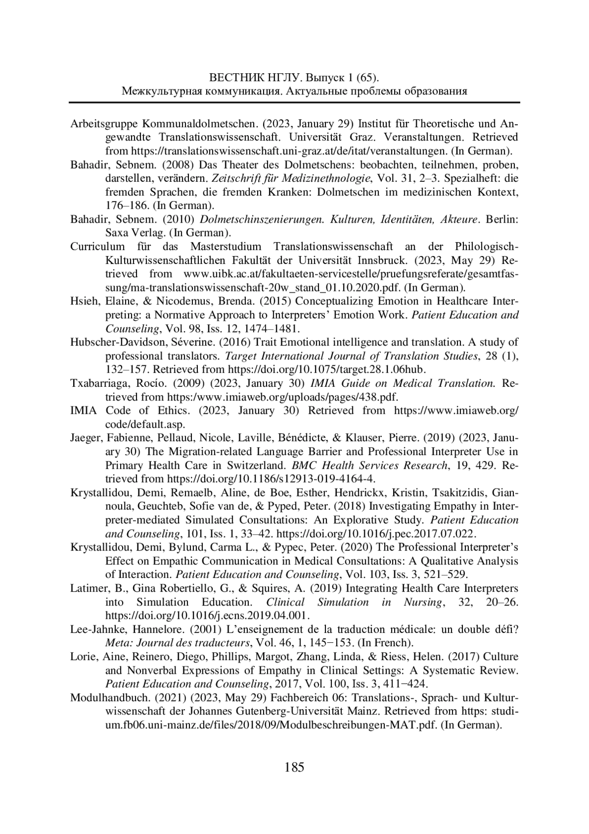 24. Strelow, Kai-Uwe R., Bahadır, Şebnem, Stollhof, Bettina, Heeb, Rita M., & Buggenhagen, Holger. (2021) (2023, May 29) Patient Interviews in Interprofessional and Intercultural Contexts (PinKo) - Project Report on Interdisciplinary Competence Development in Students of Medicine, Pharmacy, and Community Interpreting. GMS Journal for Medical Education, 38 (3), 1-19. Retrieved from https://www.egms.de/static/ en/journals/zma/2021-38/zma001463.shtml. DOI: 10.3205/zma001463