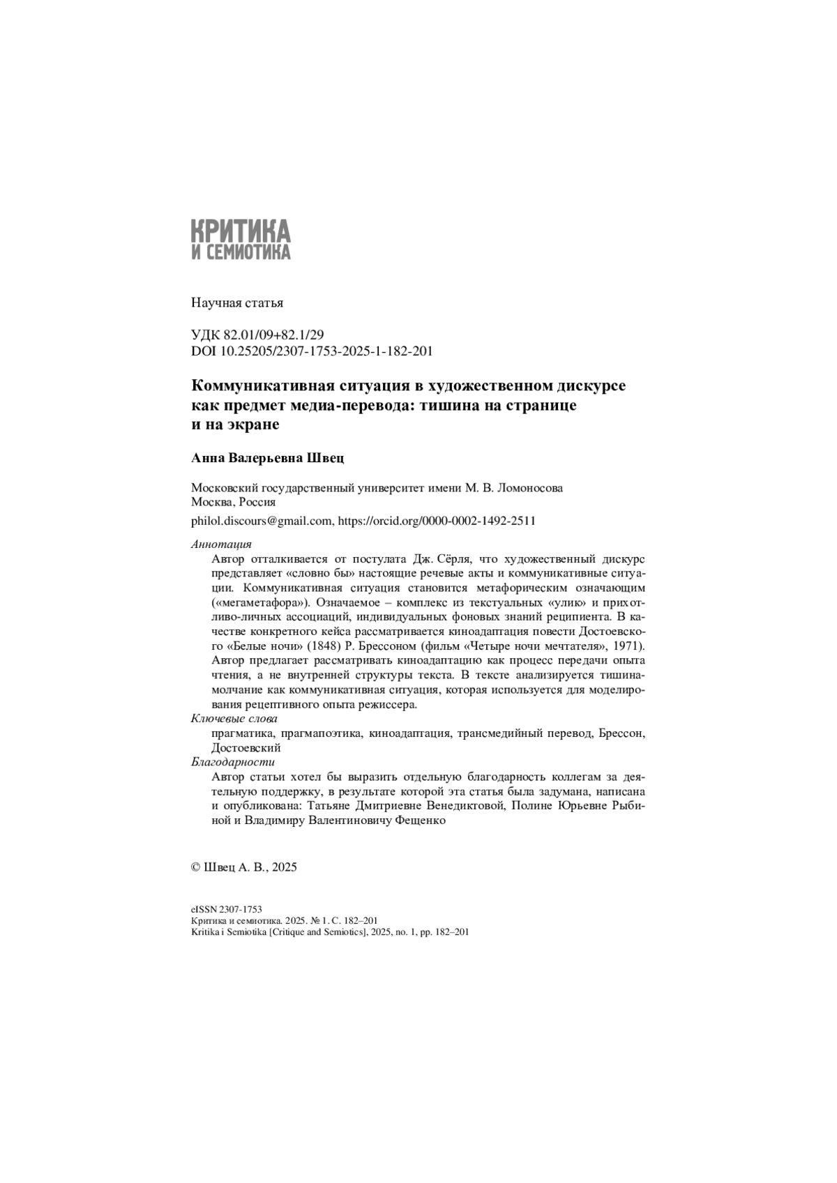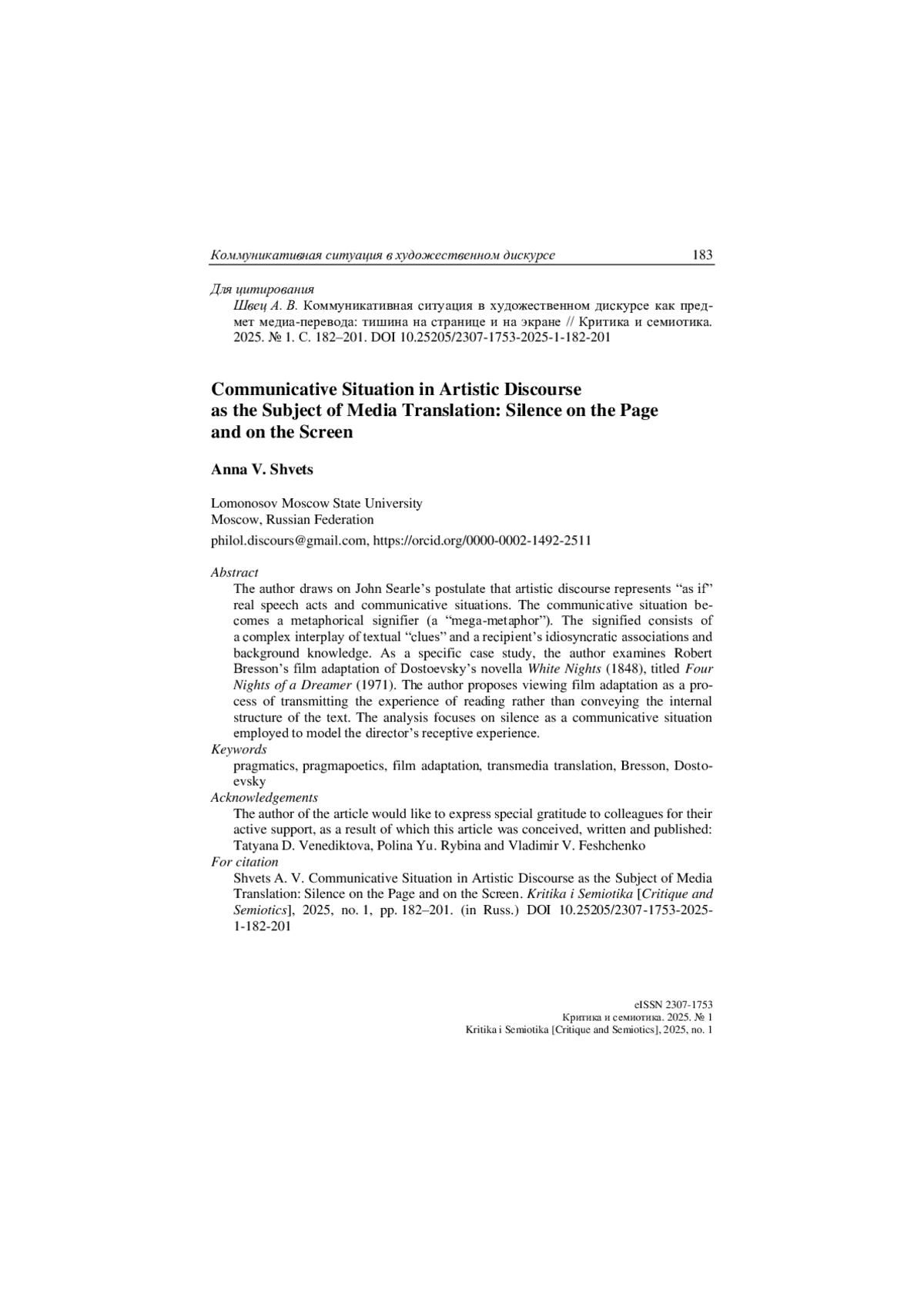 Автор отталкивается от постулата Дж. Сёрля, что художественный дискурс представляет «словно бы» настоящие речевые акты и коммуникативные ситуации. Коммуникативная ситуация становится метафорическим означающим («мегаметафора»). Означаемое – комплекс из текстуальных «улик» и прихотливо-личных ассоциаций, индивидуальных фоновых знаний реципиента. В качестве конкретного кейса рассматривается киноадаптация повести Достоевского «Белые ночи» (1848) Р. Брессоном (фильм «Четыре ночи мечтателя», 1971). Автор предлагает рассматривать киноадаптацию как процесс передачи опыта чтения, а не внутренней структуры текста. В тексте анализируется тишинамолчание как коммуникативная ситуация, которая используется для моделирования рецептивного опыта режиссера.