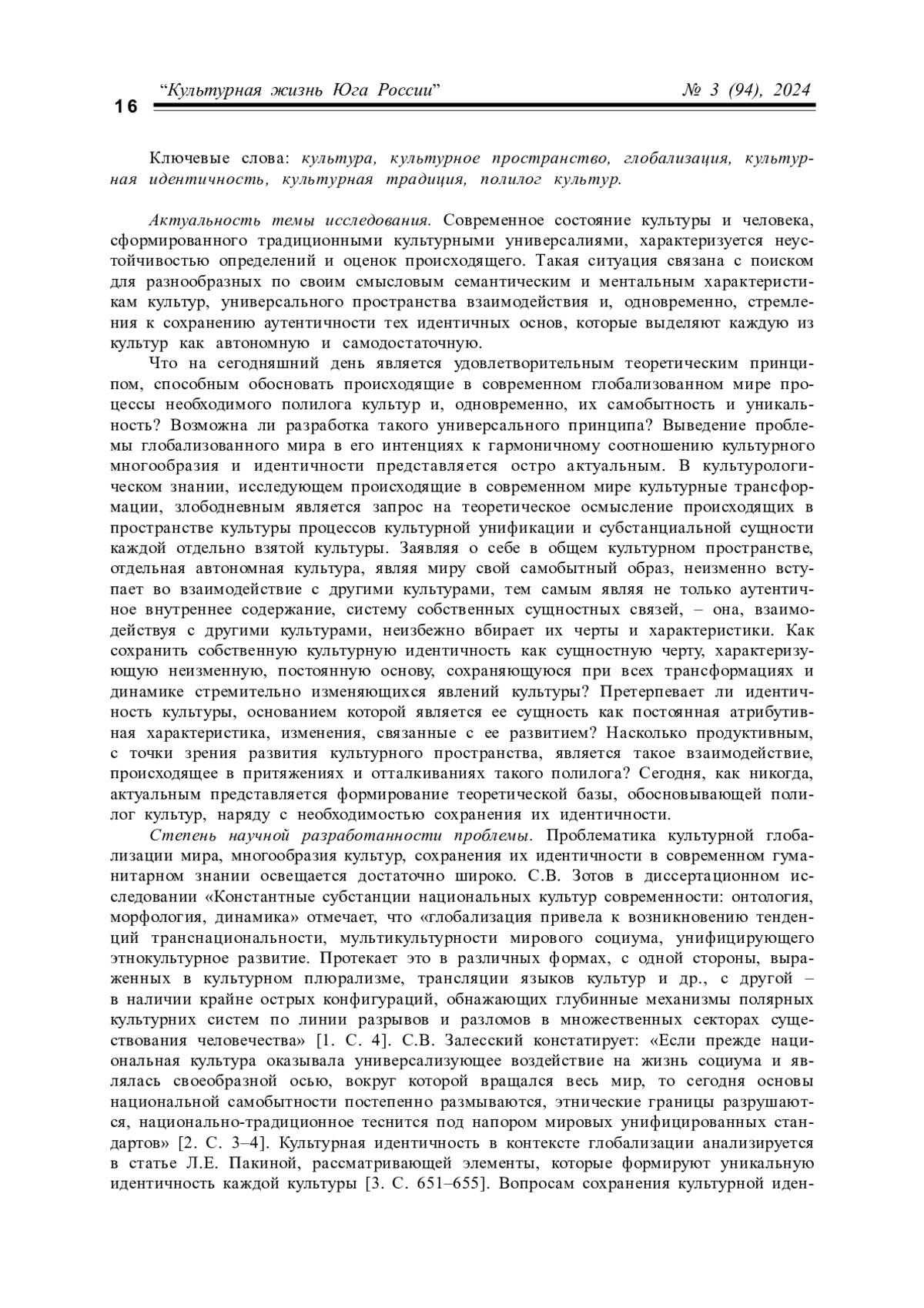 3. Пакина Л. Е. Феномен культурной идентичности в контексте глобализации // Международный научно-исследовательский журнал. 2024. № 4. С. 651-655. EDN: JYJHZB
