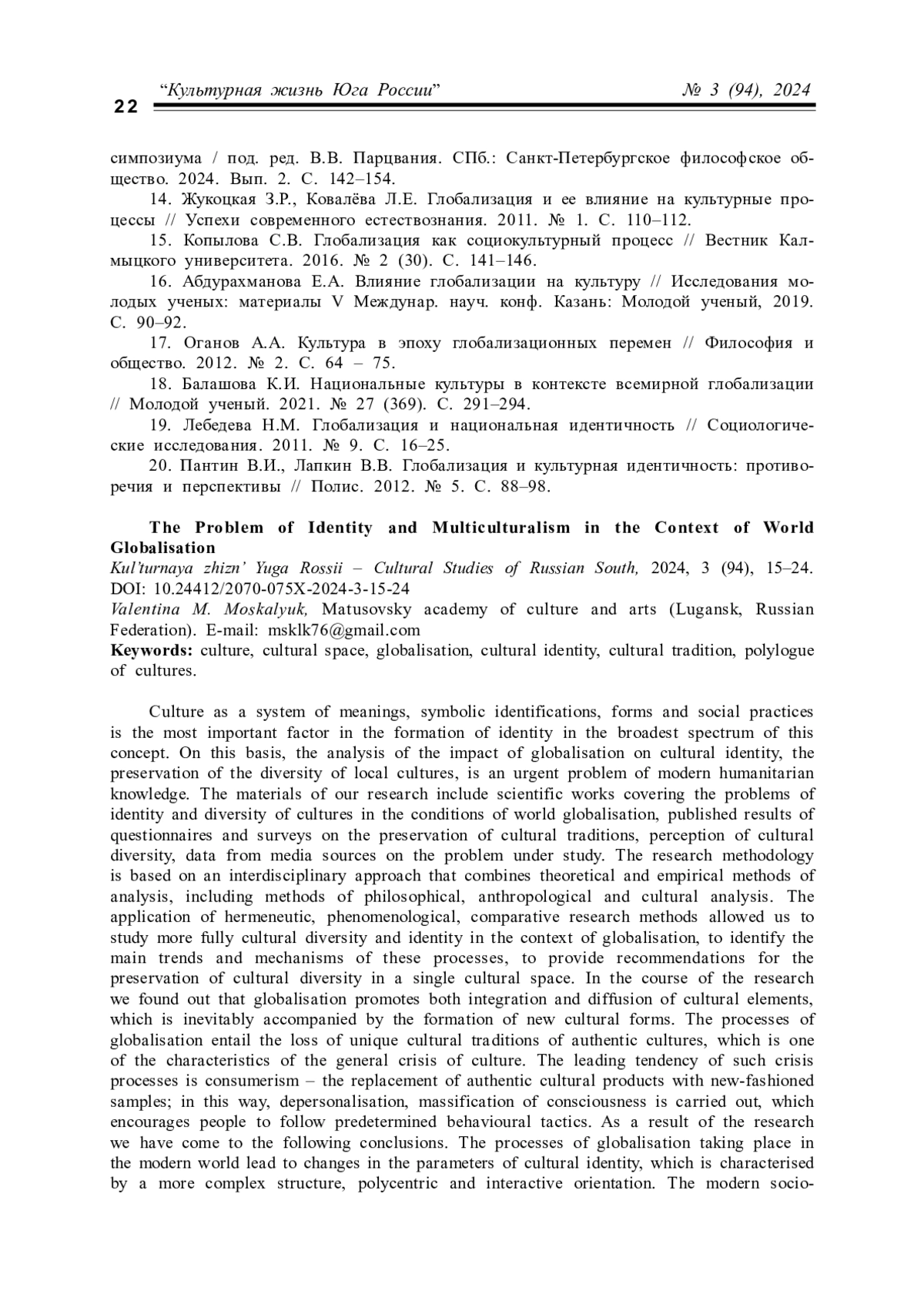 20. Пантин В.И., Лапкин В.В. Глобализация и культурная идентичность: противоречия и перспективы // Полис. 2012. № 5. С. 88-98.