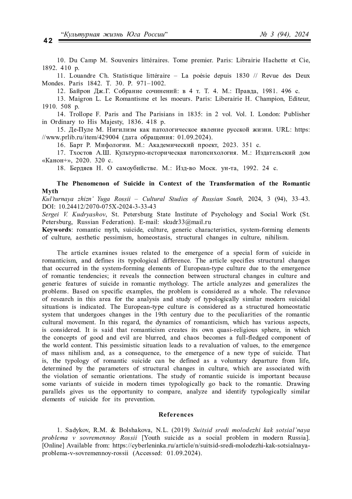 8. Кудряшов С.В. Эстетическая оформленность суицида в контексте культуры // Вестник Русской христианской гуманитарной академии. 2012. Т. 13. № 3. С. 169-175. EDN: PVZFTX