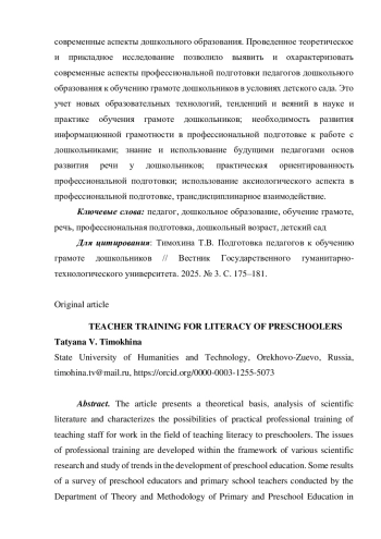 В статье представлены теоретическое обоснование, анализ научной литературы и охарактеризованы возможности практической профессиональной подготовки педагогических кадров к работе в области обучения грамоте дошкольников. Вопросы профессиональной подготовки разрабатываются в рамках различных научных исследований и изучения тенденций развития дошкольного образования. Приведены некоторые результаты проведенного кафедрой теории и методики начального и дошкольного образования опроса воспитателей дошкольных образовательных организаций и учителей начальных классов в плане проблематики подготовки детей к обучению грамоте. Представлены некоторые результаты научного исследования, проведенного 2024-2025 учебном году кафедрой теории и методики начального и дошкольного образования ГГТУ. Качественные характеристики профессиональной готовности студентов к обучению грамоте дошкольников в условиях детского сада были оценены по параметрам, отражающим современные аспекты дошкольного образования. Проведенное теоретическое и прикладное исследование позволило выявить и охарактеризовать современные аспекты профессиональной подготовки педагогов дошкольного образования к обучению грамоте дошкольников в условиях детского сада. Это учет новых образовательных технологий, тенденций и веяний в науке и практике обучения грамоте дошкольников; необходимость развития информационной грамотности в профессиональной подготовке к работе с дошкольниками; знание и использование будущими педагогами основ развития речи у дошкольников; практическая ориентированность профессиональной подготовки; использование аксиологического аспекта в профессиональной подготовке, трансдисциплинарное взаимодействие.