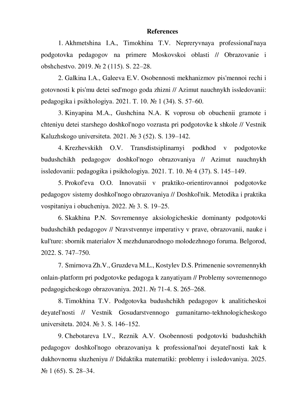 1. Ахметшина И.А., Тимохина Т.В. Непрерывная профессиональная подготовка педагогов на примере Московской области // Образование и общество. 2019. № 2 (115). С. 22-28. EDN: HLWTDO