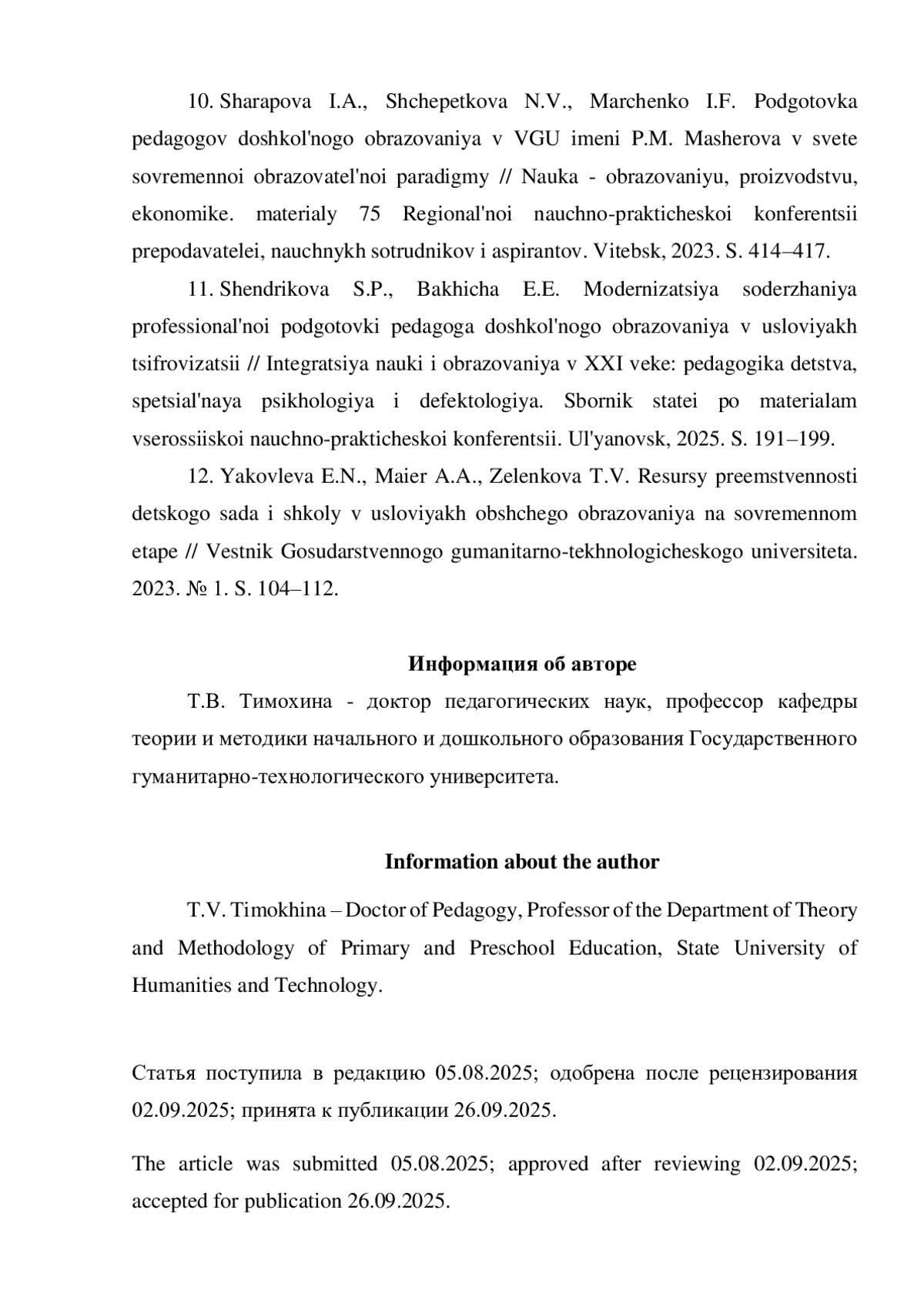 11. Шендрикова С.П., Бахича Э.Э. Модернизация содержания профессиональной подготовки педагога дошкольного образования в условиях цифровизации // Интеграция науки и образования в XXI веке: педагогика детства, специальная психология и дефектология. Сборник статей по материалам всероссийской научно-практической конференции. Ульяновск, 2025. С. 191-199. EDN: PPXAXJ