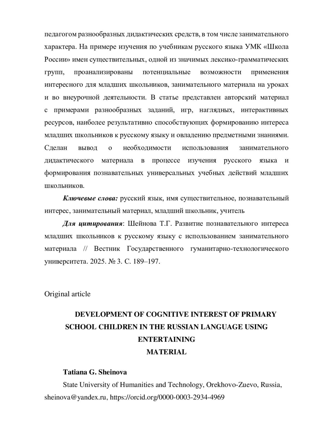 17. Шейнова Т.Г. Формирование предметных результатов младших школьников при изучении морфологии // Вестник государственного гуманитарно-технологического университета. 2025. №1. С. 134-140. EDN: MEYLYF