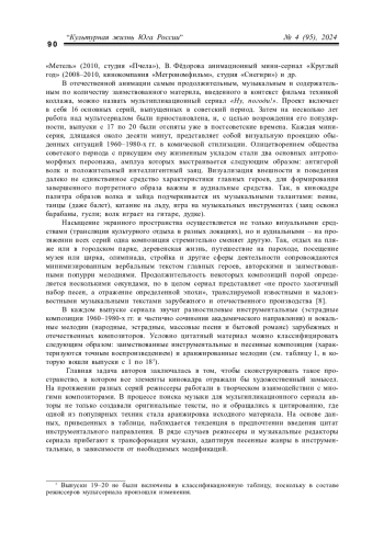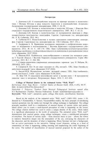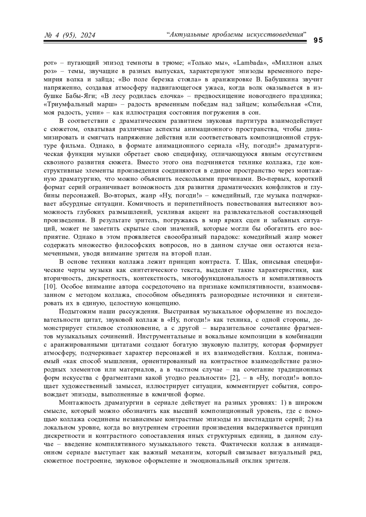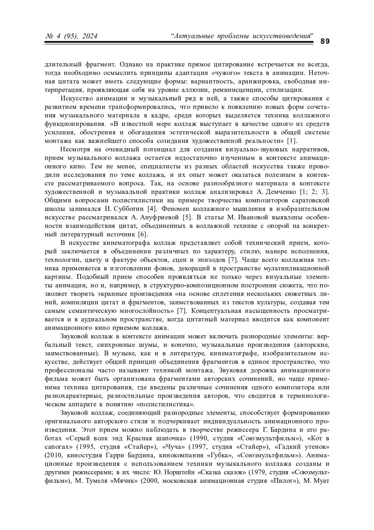 На основе анализа анимационного сериала «Ну, погоди!» (1969–1993 гг., реж. В. Котёночкин и В. Тарасов, студия «Союзмультфильм») выделены принципы интеграции музыкальных цитат в медиатекст через технику коллажа. Предложена классификация музыкального материала на основе точного цитирования инструментальных и вокальных произведений и введения аранжированных цитат. Исследование взаимосвязи между музыкальным оформлением и визуальными элементами в анимации дает возможность по-новому рассмотреть применение техники коллажа в художественной практике
