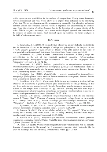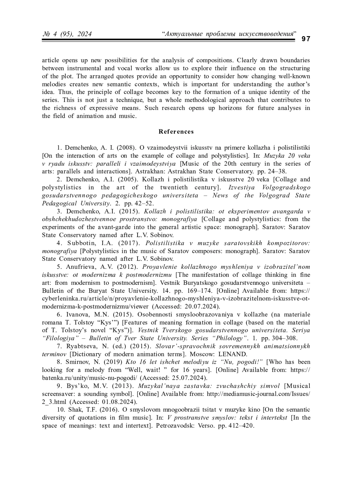 1. Демченко А.И. О взаимодействии искусств на примере коллажа и полистилистики // Музыка ХХ века в ряду искусств: параллели и взаимодействия. Астрахань: Астраханская государственная консерватория, 2008. С. 24-38.