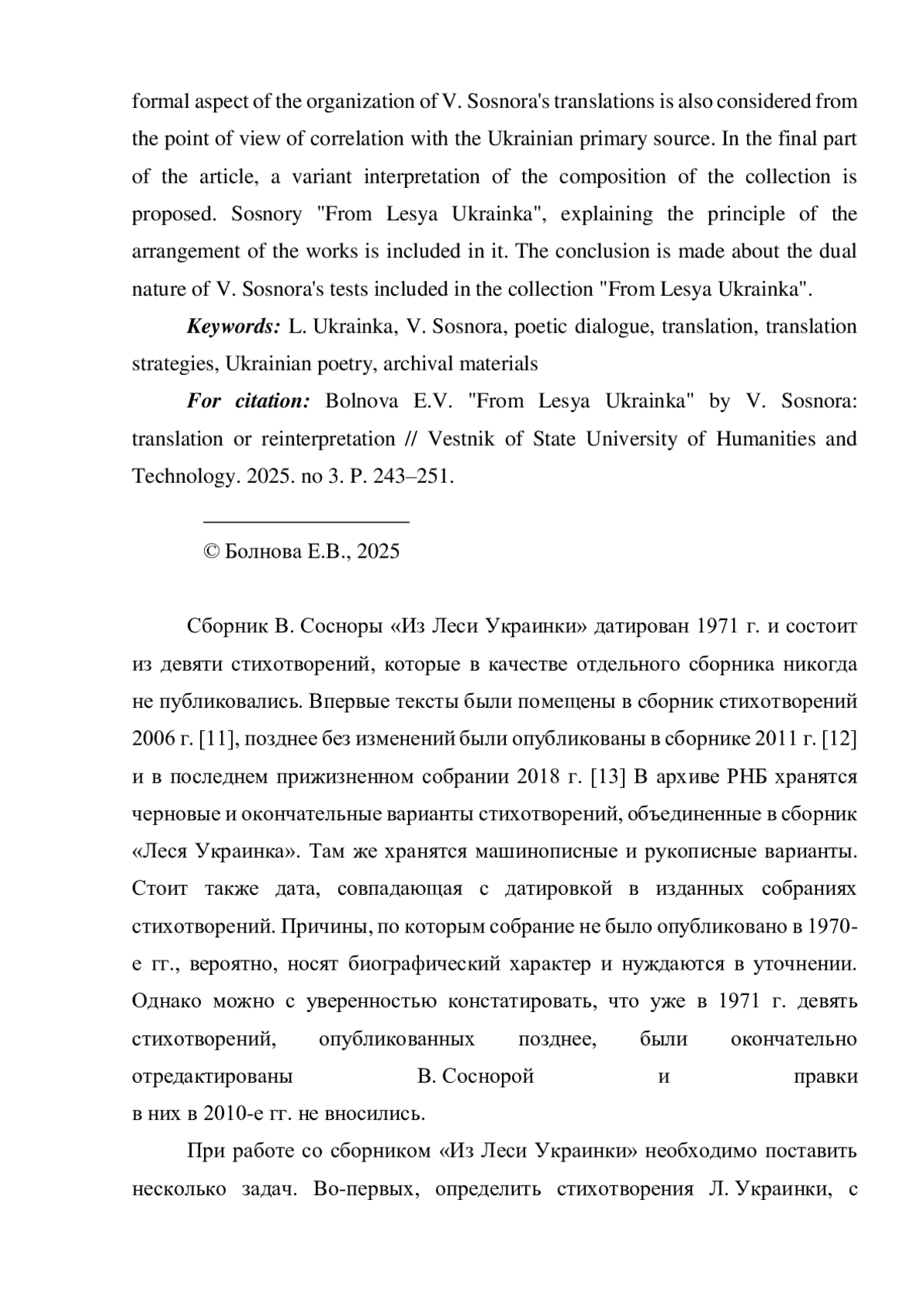 В статье рассматривается поэтический сборник В. Сосноры «Из Леси Украинки» с точки зрения его соотнесенности со стихотворениями украинской поэтессы рубежа XIX-XX вв. Леси Украинки. Определены стихотворения украинского поэта, к которым обращался автор. Поставлены вопросы соотношения оригинала и перевода, переводческой стратегии В. Сосноры, принципов работы с украинскими текстами. В качестве дополнительного материала привлекаются архивные материалы, содержащие черновые варианты переводов стихотворений Л. Украинки. Анализируется и обнаруженный среди них неоконченный перевод стихотворения «Епільоґ». Обращение к творческой лаборатории автора позволяет сделать некоторые выводы об общем векторе работы В. Сосноры над переводами стихотворений Л. Украинки. Анализируются изменения, затрагивающие идейно-тематический уровень, вносимые в систему образов, в заглавия текстов. Рассмотрена и формальная сторона организации переводов В. Сосноры с точки зрения соотнесения с украинским первоисточником. В заключительной части статьи предлагается вариант трактовки композиции сборника В. Сосноры «Из Леси Украинки», объясняющий принцип компоновки входящих в него произведений. Делается вывод о двойственной природе тестов В. Сосноры, входящих в сборник «Из Леси Украинки».