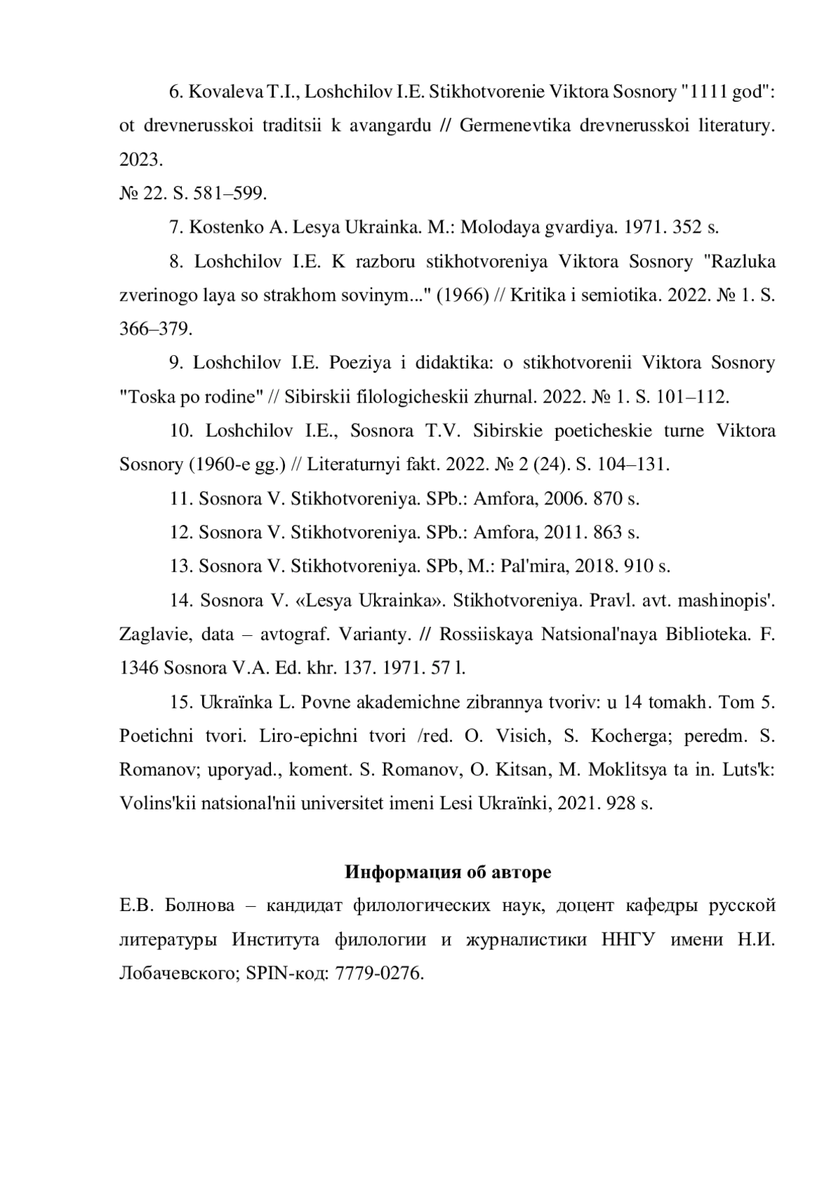 9. Лощилов И.Е. Поэзия и дидактика: о стихотворении Виктора Сосноры “Тоска по родине” // Сибирский филологический журнал. 2022. № 1. С. 101-112. EDN: XAERYR