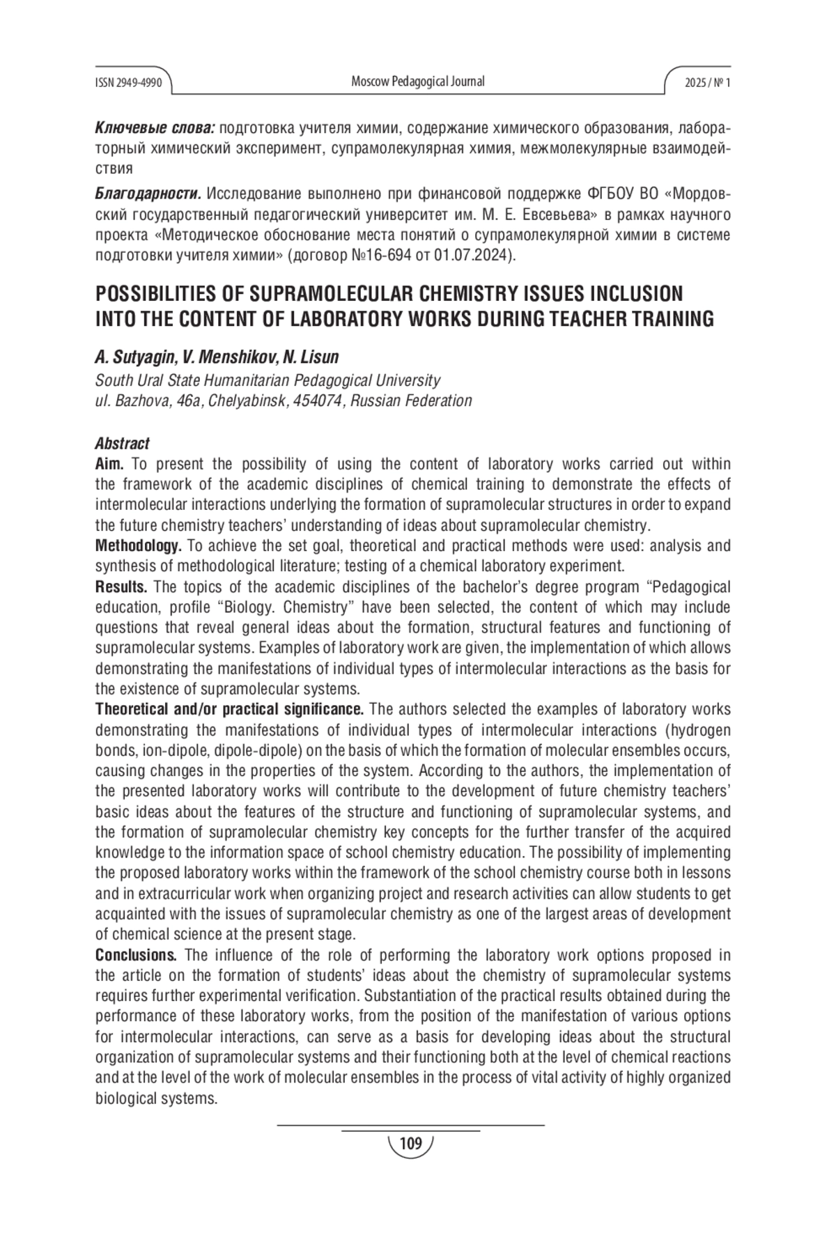 11. Сутягин А. А., Меньшиков В. В. Изучение понятий супрамолекулярной химии при подготовке будущих учителей // Актуальные проблемы естественно-технологического образования: сборник научных трудов по материалам Международной научно-практической конференции. Саранск, 14-15 марта 2019 г. / под ред. М. В. Лабутиной, Т. А. Маскаевой, В. В. Панькиной. Саранск: Издательство Мордовского государственного педагогического института имени М. Е. Евсевьева, 2019. С. 198-203. EDN: KJDMHD