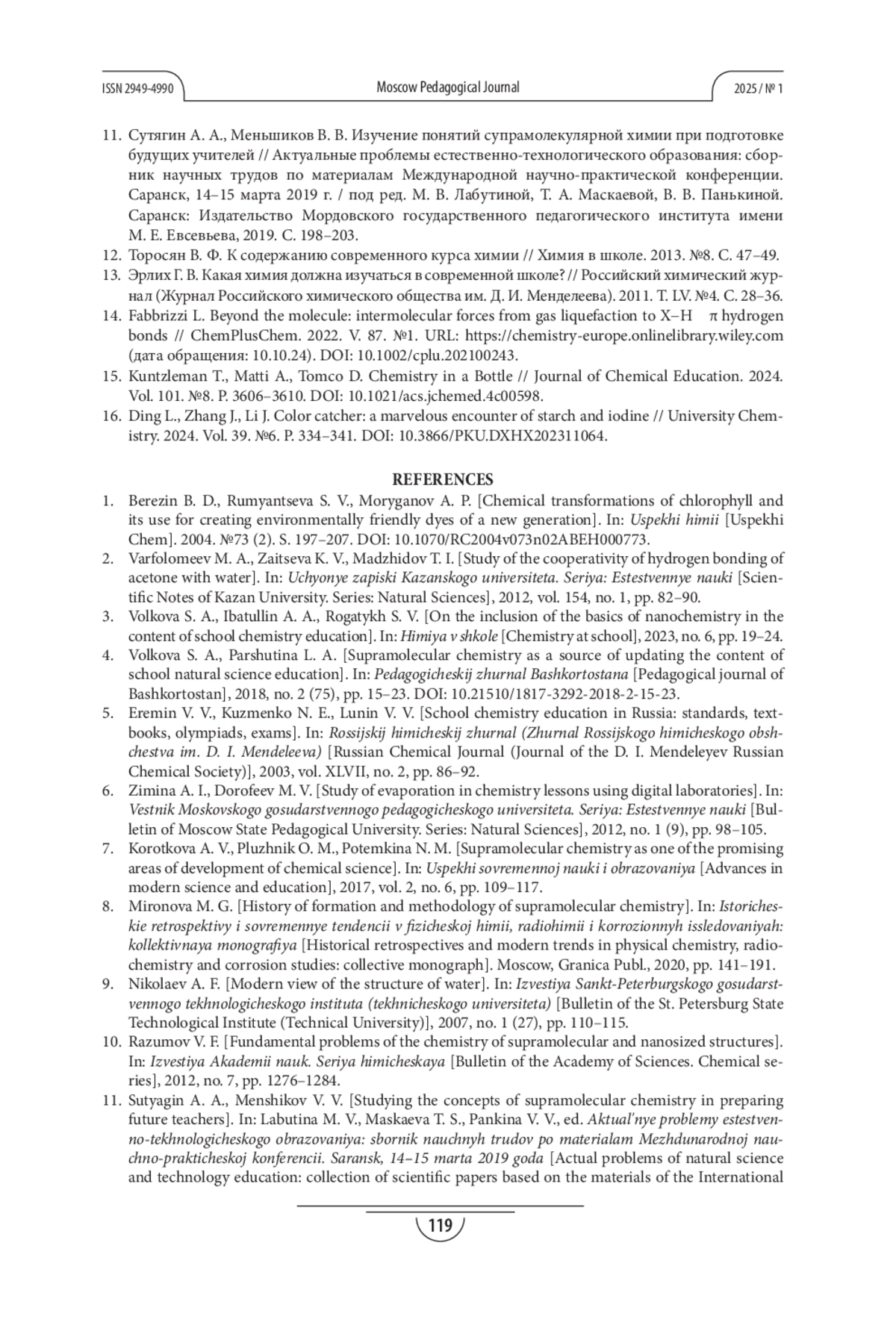 3. Волкова С. А., Ибатуллин А. А., Рогатых С. В. О включении основ нанохимии в содержание школьного химического образования // Химия в школе. 2023. №6. С. 19-24. EDN: FXPBEE