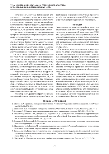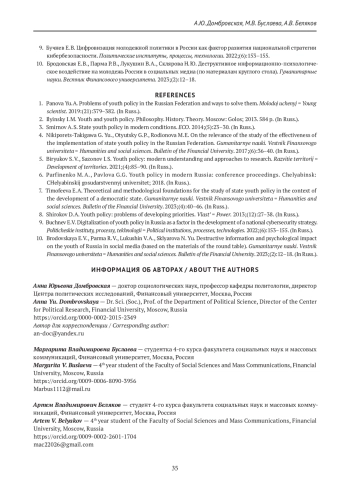 5. Бирюков С. В., Сазонов И. С. Молодежная политика: современное понимание и подходы к исследованию. Развитие территорий. 2021;(4):85-90.