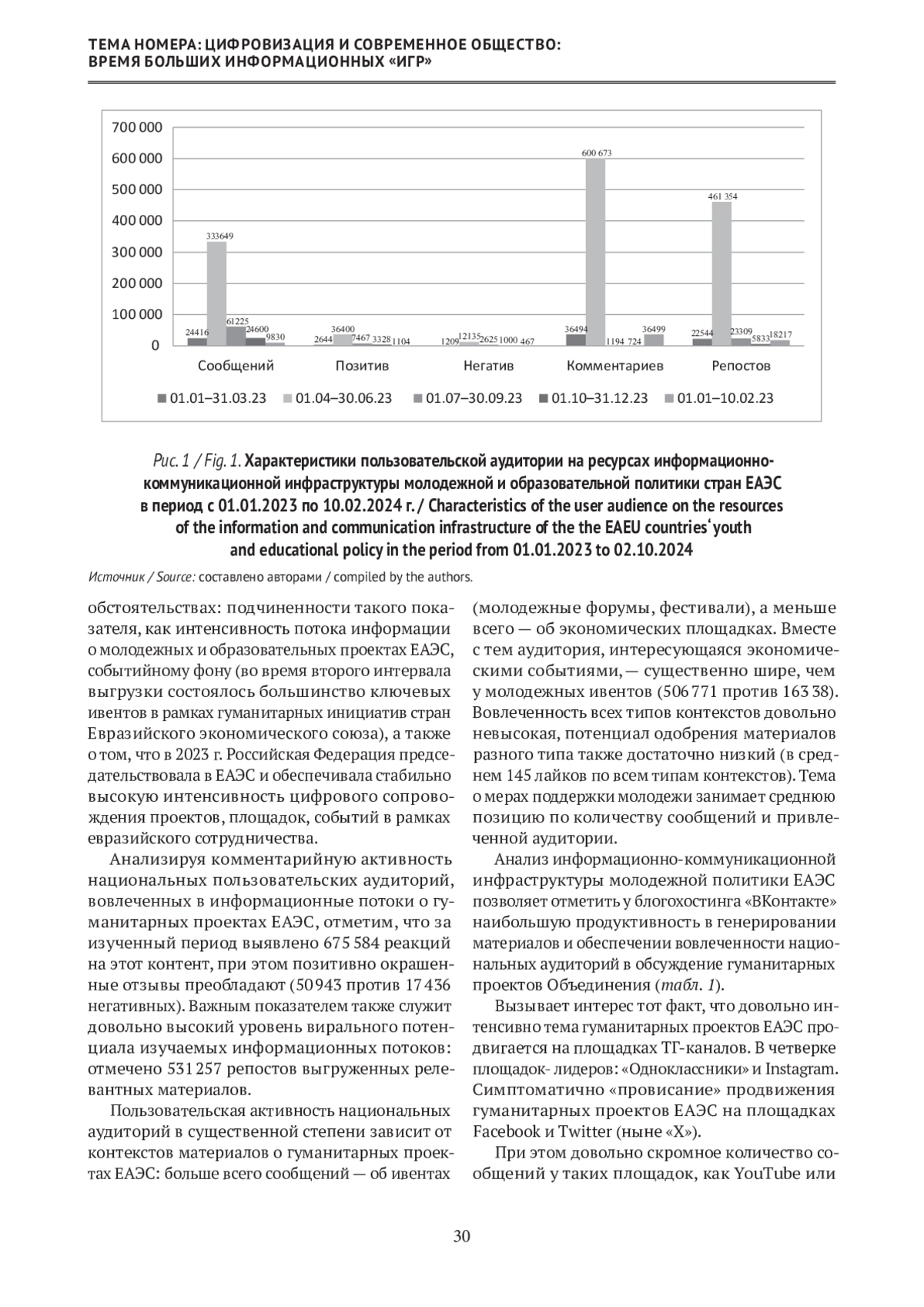 В статье проводится анализ цифрового сопровождения совместных инициатив стран Евразийского экономического союза (ЕАЭС) в сфере молодежной и образовательной политики. Исследование предполагало аккумулирование документов социальных медиа, отражающих маркеры онлайн-сетевого продвижения гуманитарных проектов ЕАЭС в 2023 — начале 2024 г. Основные результаты анализа связаны с установлением динамики публикационной активности стран ЕАЭС касательно информационного сопровождения совместных гуманитарных инициатив, изменения пользовательской реакции в отношении материалов о молодежных и образовательных проектах ЕАЭС, а также с выявлением коммуникационной структуры цифровых акторов данного международного объединения. По итогам эмпирического анализа предложены меры по улучшению информационного сопровождения гуманитарных инициатив стран Евразийского экономического союза.