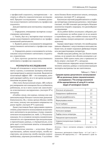 В статье содержатся результаты авторского социологического исследования, проведенного методом экспертного интервью. Выявлена степень допустимости использования искусственного интеллекта в работе социолога, описан опыт применения новых технологий в научно-исследовательской деятельности, а также определены его преимущества и недостатки — как для студентов, так и для опытных специалистов. Авторы обсуждают влияние искусственного интеллекта на методы и практики, используемые социологами, а также возможные этические дилеммы, которые могут возникнуть в процессе его внедрения в социологию. Особое внимание уделяется задействованию нейросети студентами-социологами и воздействию данной тенденции на качество их подготовки и компетенции. Подчеркивается влияние искусственного интеллекта на трансформацию рынка труда.