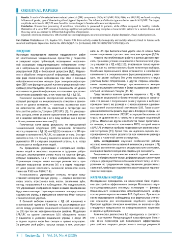 Цель. Изучение особенностей работы мозга по компонентам вызванной активности у женщин с рекуррентной и биполярной депрессией при выполнении задания с эмоциональными стимулами, имеющими биологическую или социальную значимость; прикладная задача исследования предполагает дифференциацию клинически сходных, но гетерогенных депрессивных состояний, требующих существенно различающихся терапевтических подходов.