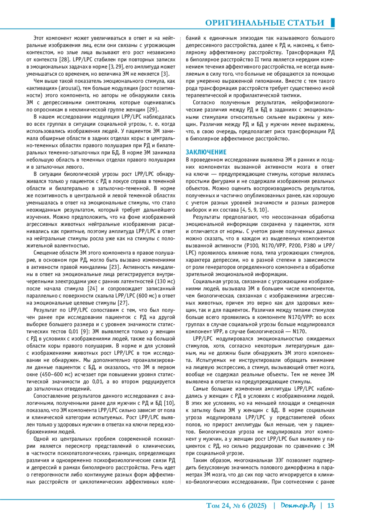 10. Мнацаканян E.B., Крюков B.B., Краснов B.H. Вызванные ответы мозга на негативные стимулы у мужчин с рекуррентной и биполярной депрессией. Доктор.Ру. 2023;22(6):28-34.