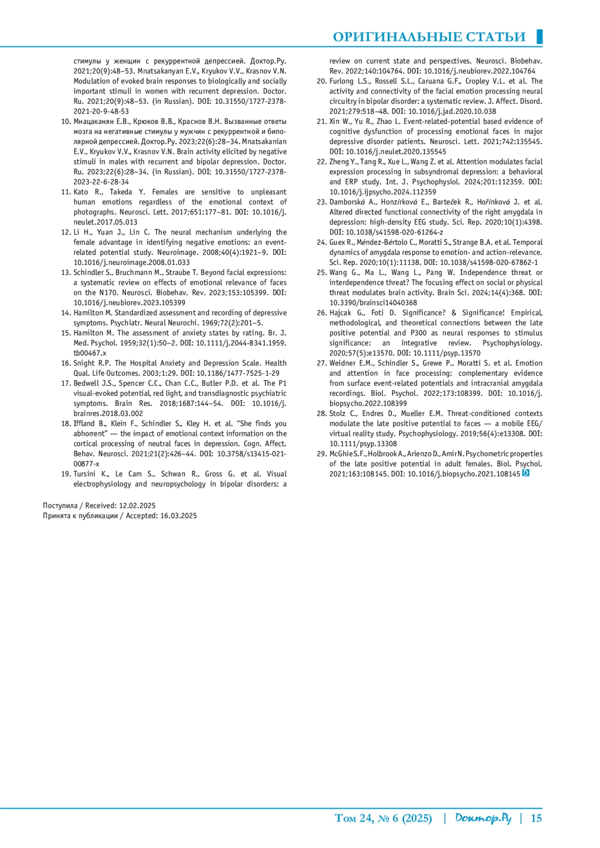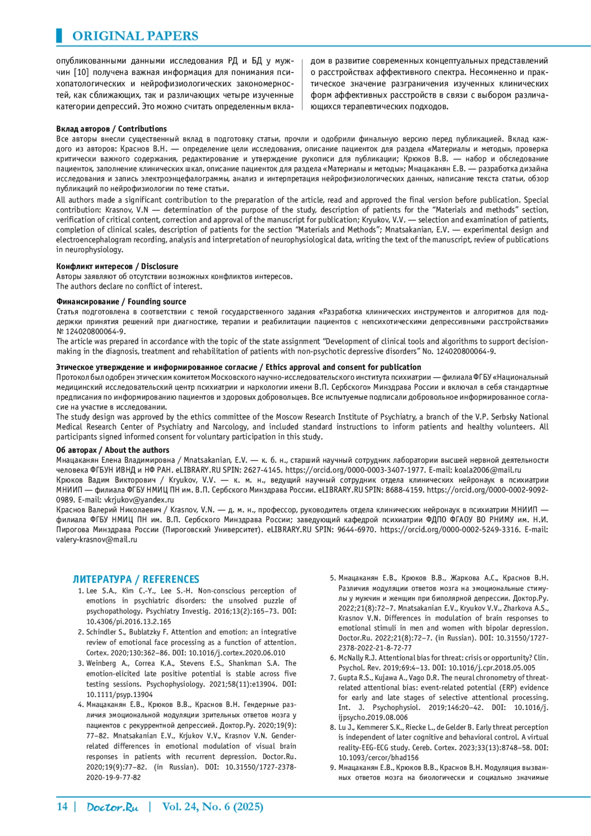 4. Мнацаканян E.B., Крюков В.В., Краснов В.Н. Еендерные различия эмоциональной модуляции зрительных ответов мозга у пациентов с рекуррентной депрессией. Докгор.Ру. 2020;19(9): 77-82.