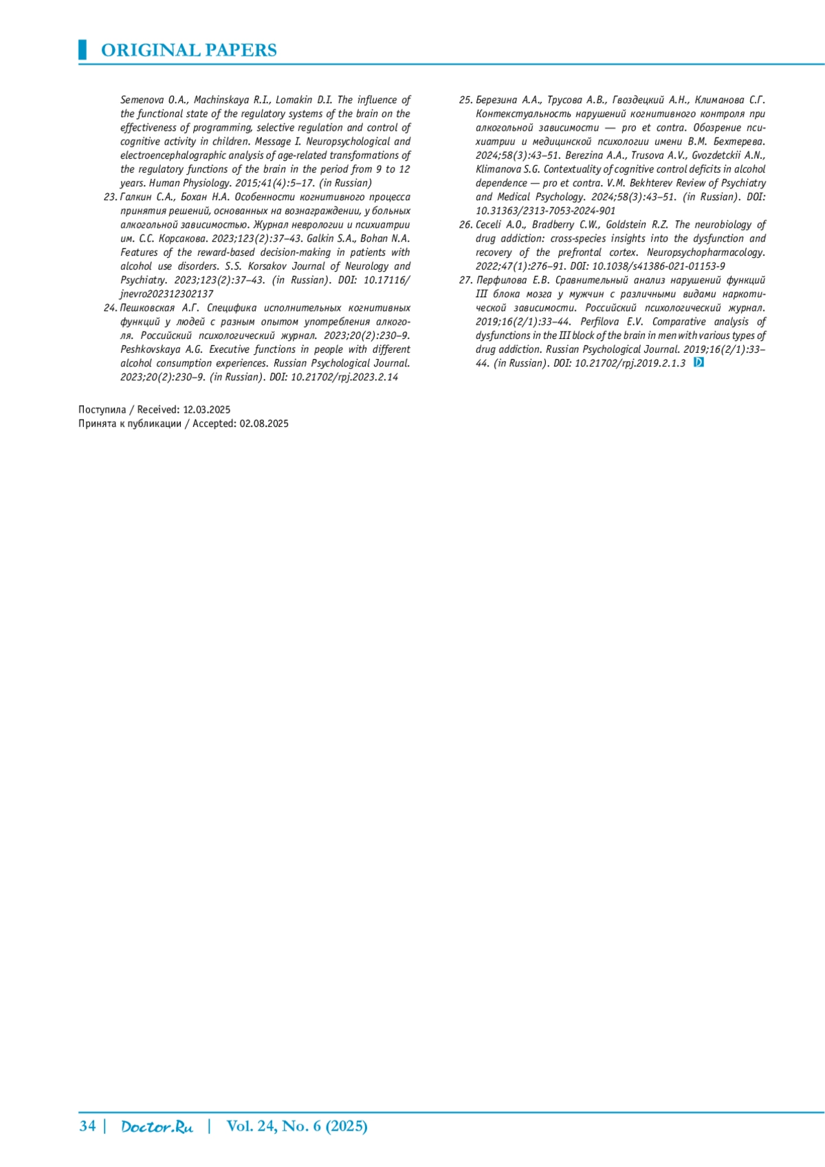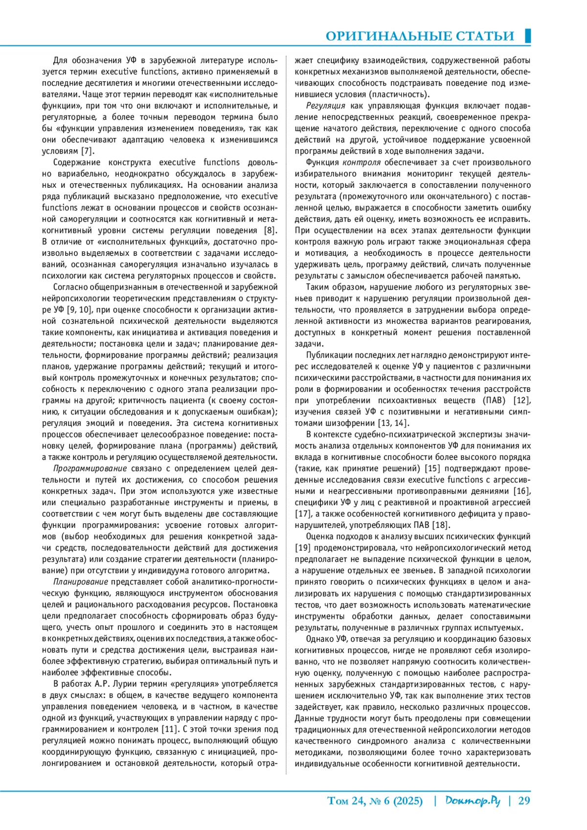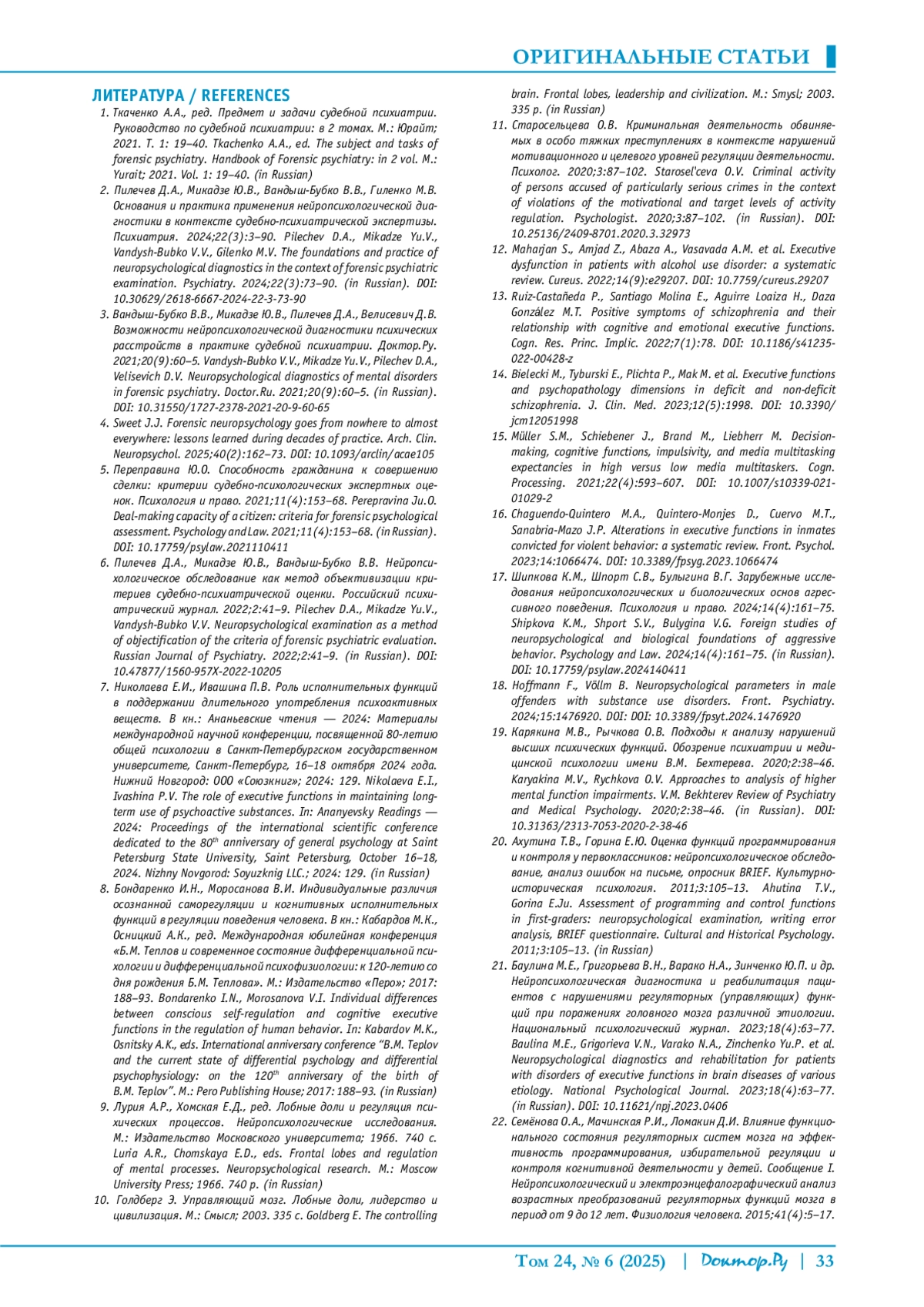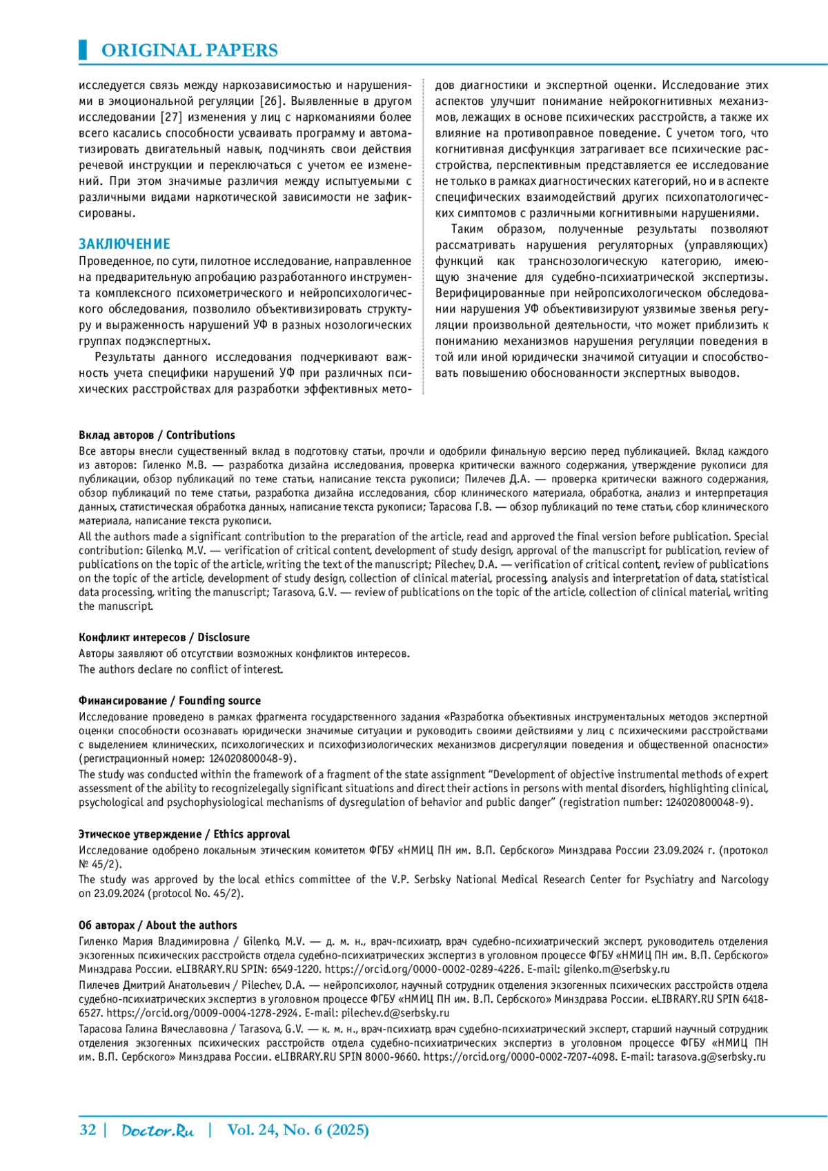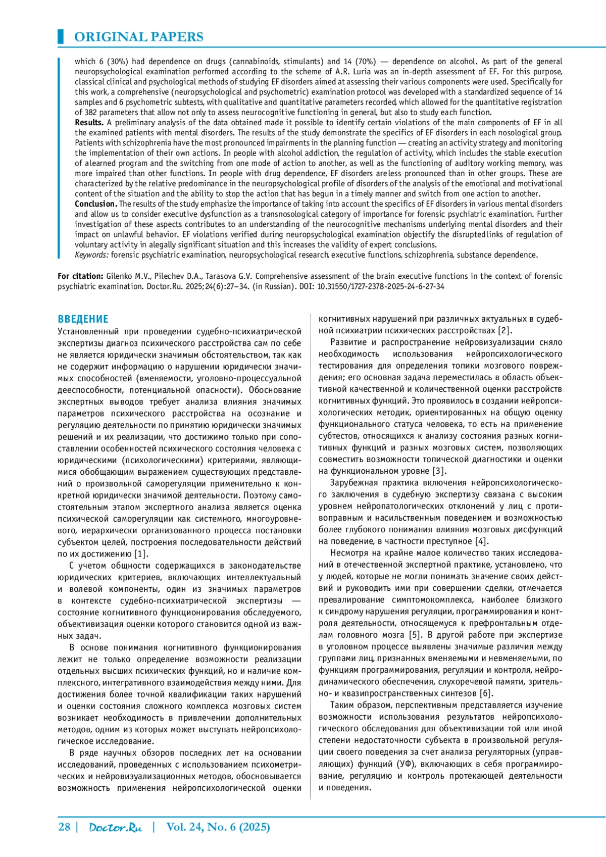 ГИЛЕНКО М. В., ПИЛЕЧЕВ Д. А., ТАРАСОВА Г. В. КОМПЛЕКСНАЯ ОЦЕНКА УПРАВЛЯЮЩИХ ФУНКЦИЙ МОЗГА В КОНТЕКСТЕ ЗАДАЧ СУДЕБНО-ПСИХИАТРИЧЕСКОЙ ЭКСПЕРТИЗЫ // ДОКТОР. РУ. 2025. № 6, ТОМ 24