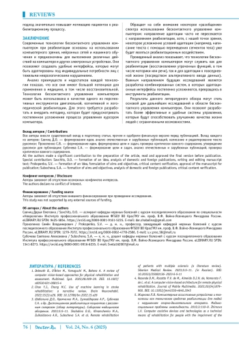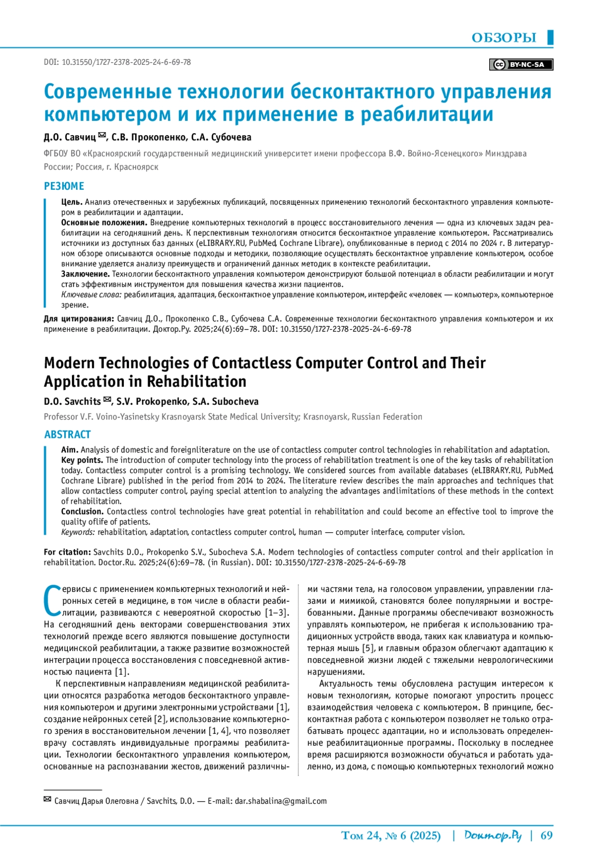 Цель. Анализ отечественных и зарубежных публикаций, посвященных применению технологий бесконтактного управления компьютером в реабилитации и адаптации.