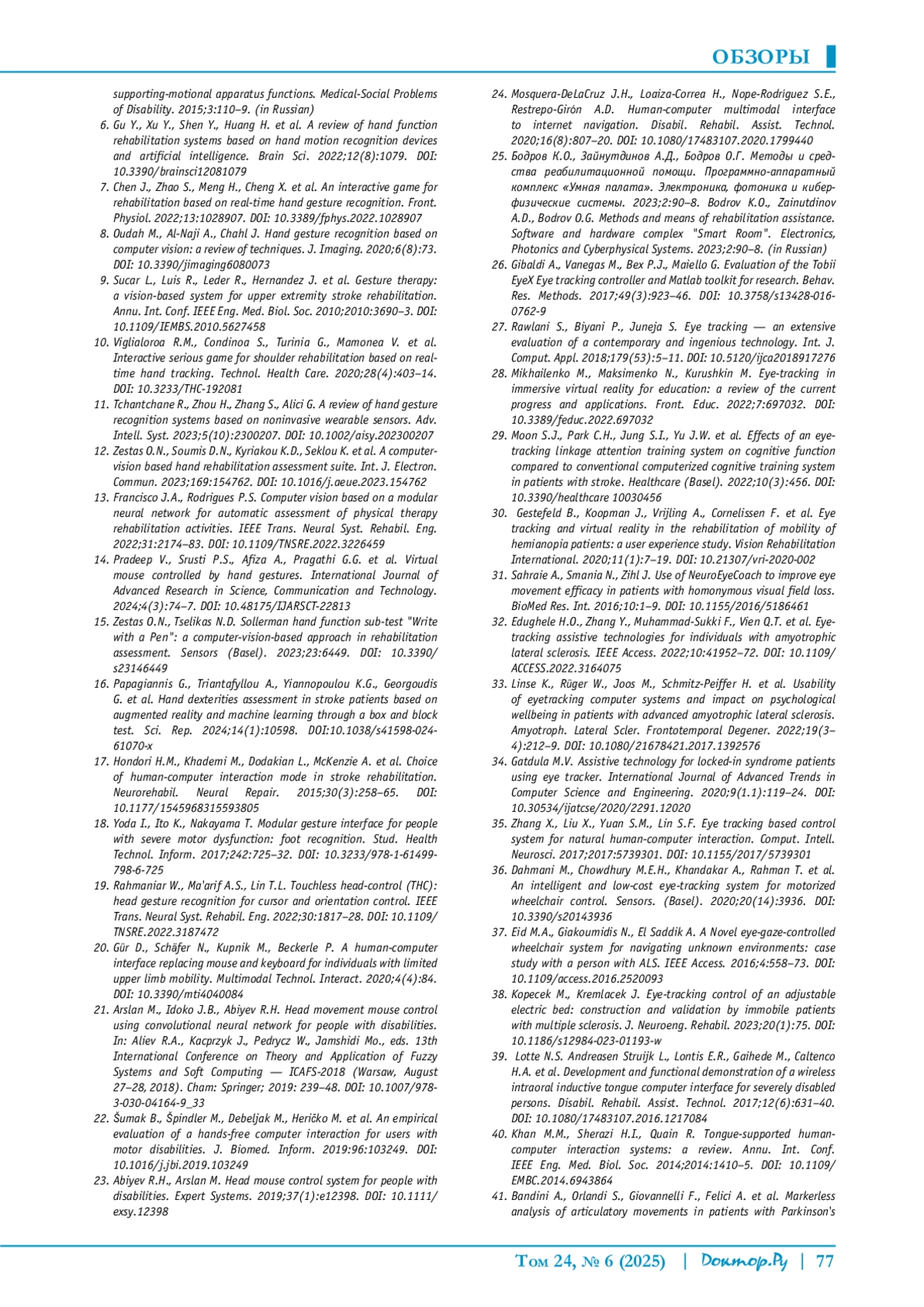 25. Бодров K.O., Зайнутдинов А.Д., Бодров O.E. Методы и средства реабилитационной помощи. Программно-аппаратный комплекс “Умная палата”. Электроника, фотоника и кибер-физические системы. 2023;2:90-8.