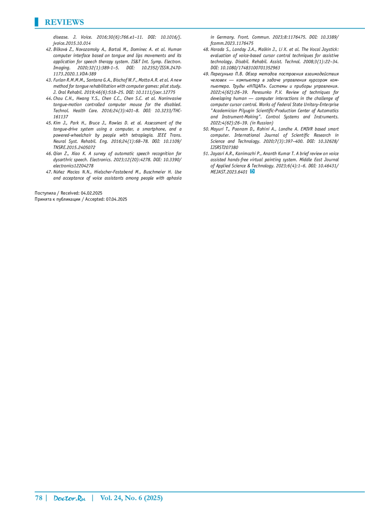 48. Harada S., Landay J.A., Malkin J., Li X. et al. The Vocal Joystick: evaluation of voice-based cursor control techniques for assistive technology. Disabil. Rehabil. Assist. Technol. 2008;3(l):22-34. DOI: 10.1080/17483100701352963