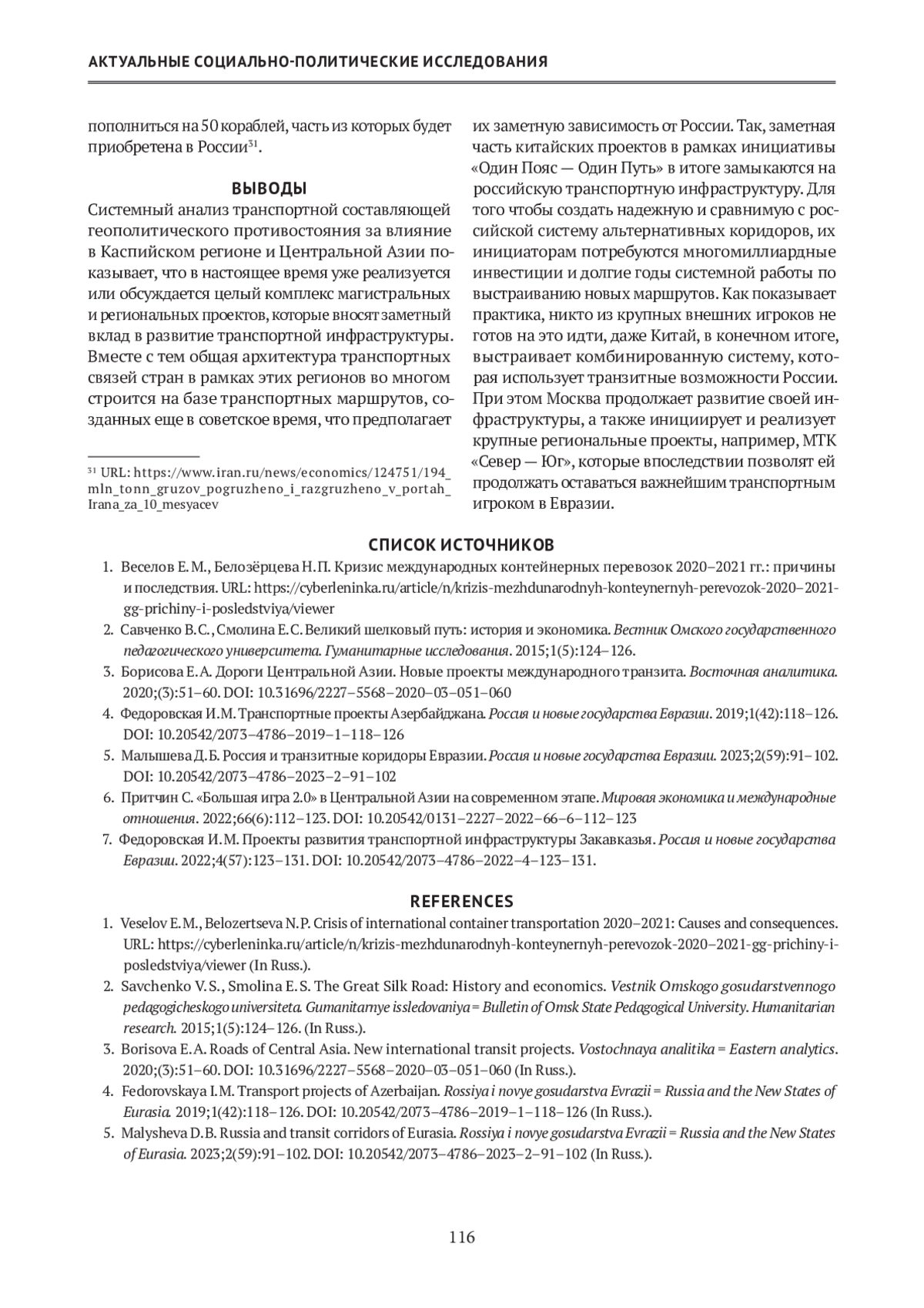 7. Федоровская И. М. Проекты развития транспортной инфраструктуры Закавказья. Россия и новые государства Евразии. 2022;4(57):123-131. https://doi.org/10.20542/2073-4786-2022-4-123-131.