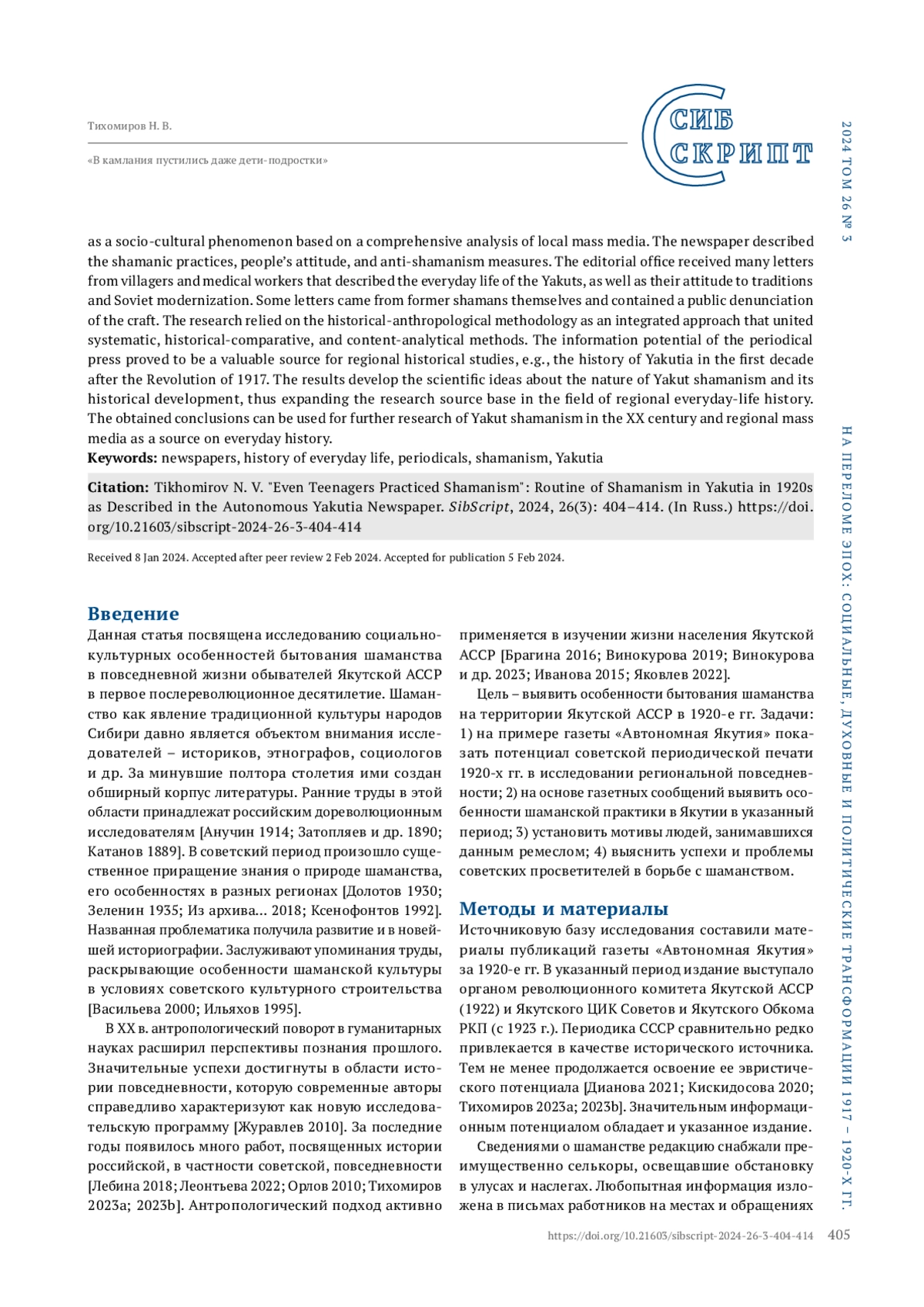Статья посвящена проблеме шаманства и его месту в повседневной жизни населения Якутии в 1920-е гг. Раскрывается информационный потенциал периодической печати как ценного источника для изучения региональной истории, в данном случае истории Якутии в первое послереволюционное десятилетие, чем определяется актуальность и новизна исследования. Цель – выявить особенности бытования шаманства на территории Якутской АССР в 1920-е гг. Впервые в практике изучения якутского шаманизма как социально-культурного феномена осуществлен комплексный анализ региональной прессы – публикаций газеты «Автономная Якутия». Работа построена на принципах историко-антропологической методологии, использован комплексный подход с применением системного, историко-сравнительного и контент-аналитического методов. Материалы периодической печати содержат сведения об особенностях поведения шаманов, отношении к ним населения, трудностях и успехах в борьбе с данным явлением. Письма, поступавшие в редакцию, отразили во множестве черты обыденности якутов, их отношение к традиционным верованиям и мероприятиям советской модернизации. При анализе газетных заметок представляют интерес как данные, предоставленные селькорами, так и письма медицинских работников, а также обращения самих шаманов с открытым обличением их прежнего ремесла. Результаты способствуют углублению научных представлений о природе якутского шаманства и особенностях его исторического развития, служат расширению источниковой базы в области региональной повседневности. Выводы могут быть использованы для дальнейшего исследования якутского шаманства в ХХ в. и методологического освоения региональной прессы как источника по истории повседневности.