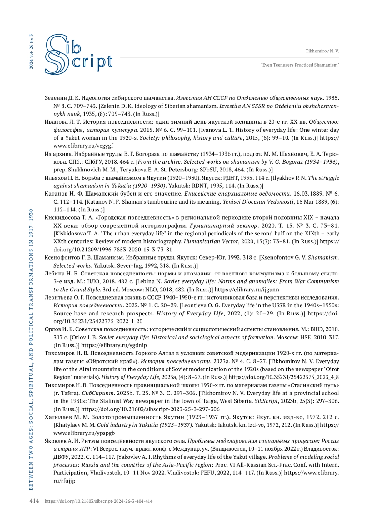 22. Тихомиров Н. В. Повседневность Горного Алтая в условиях советской модернизации 1920-х гг. (по материалам газеты «Ойротский край»). История повседневности. 2023a. № 4. С. 8-27. https://doi.org/10.35231/25422375_2023_4_8