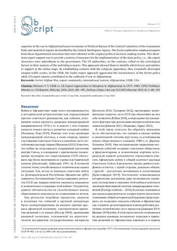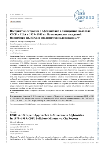 Статья посвящена исследованию специфики экспертных подходов при принятии решения о вводе войск и в ходе войны в Афганистане. В качестве источников привлечены рассекреченные документы ЦРУ, опубликованные Архивом национальной безопасности США, и стенограммы заседаний Политбюро ЦК КПСС, с которых в 1990–2000 гг. был снят гриф секретности. Комплекс привлеченных источников позволяет выявить круг субъектов, показать методы и определить роль политической экспертизы в ходе развития войны в Афганистане. Советский подход исходил из доверия к экспертной оценке лишь ряда ведомственных структур, изначально встроенных в систему принятия политических решений. Экспертная поддержка оказалась краткосрочной и была призвана обеспечить систему мер для реализации политического курса, что говорит о подчиненном положении экспертных структур политическому руководству. Американский подход, напротив, судя по рассекреченным документам ЦРУ, исходил из анализа социологических факторов развития событий, что позволило на первоначальном этапе выявить спектр сил и субъектов, которым могла быть оказана помощь. По мере установления связей с оппозиционными силами стали прорабатываться маршруты и способы поставки вооружений. Экспертные подходы советской стороны усиливали ошибочность и непоследовательность проводимой советской политики, а американские оценки объективно способствовали разжиганию войны внутри Афганистана.