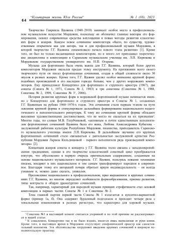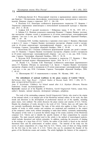 КОРНИЛЕНКО А. Н. ВОПЛОЩЕНИЕ НАЦИОНАЛЬНЫХ ТРАДИЦИЙ В ФОРТЕПИАННЫХ СОНАТАХ ГАВРИИЛА ВДОВИНА // КУЛЬТУРНАЯ ЖИЗНЬ ЮГА РОССИИ. 2023. № 1 (88)