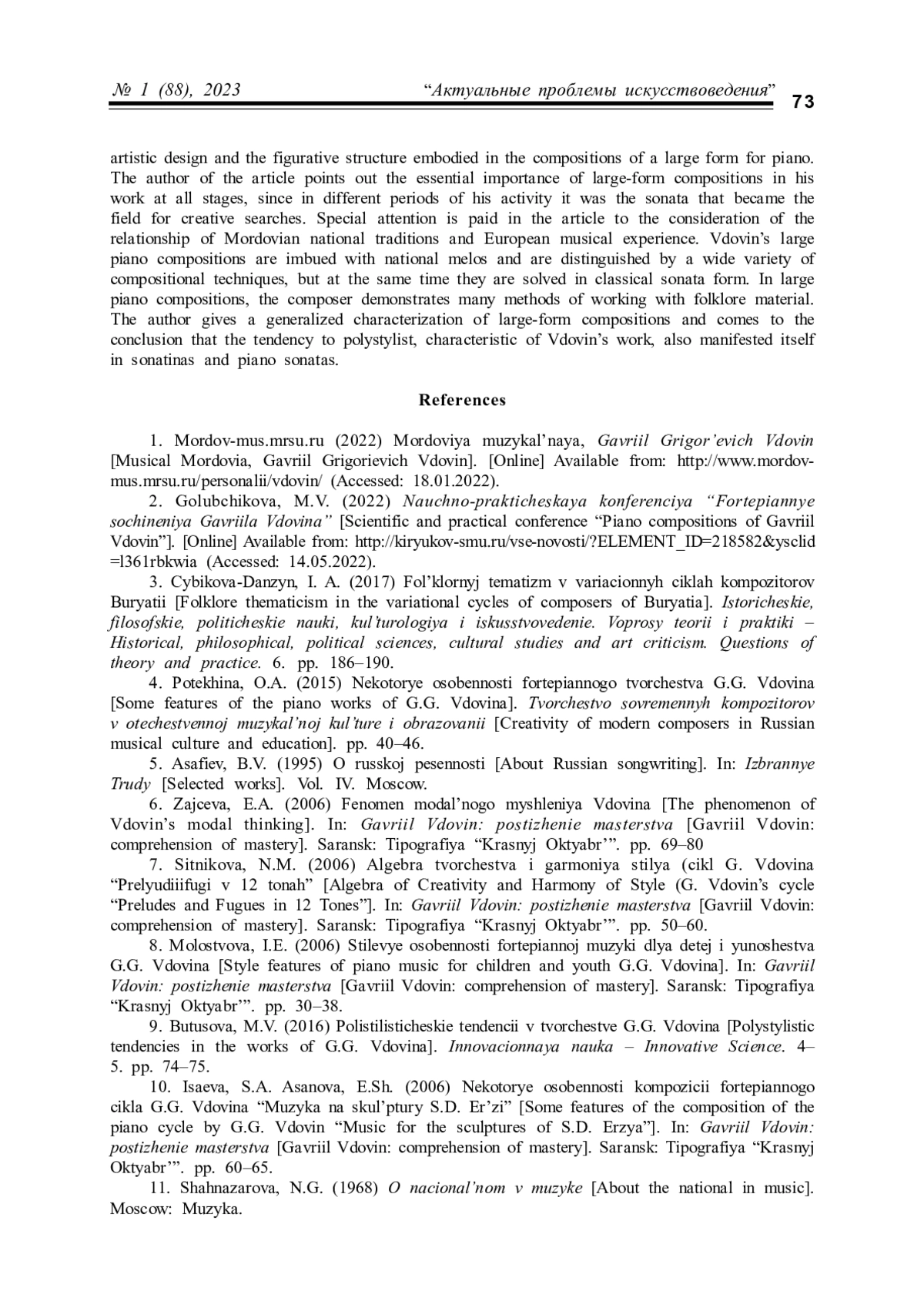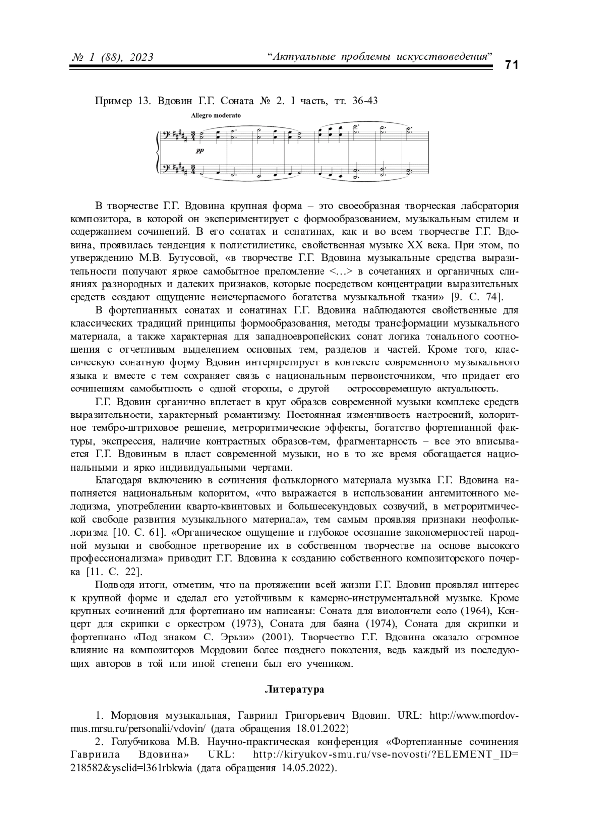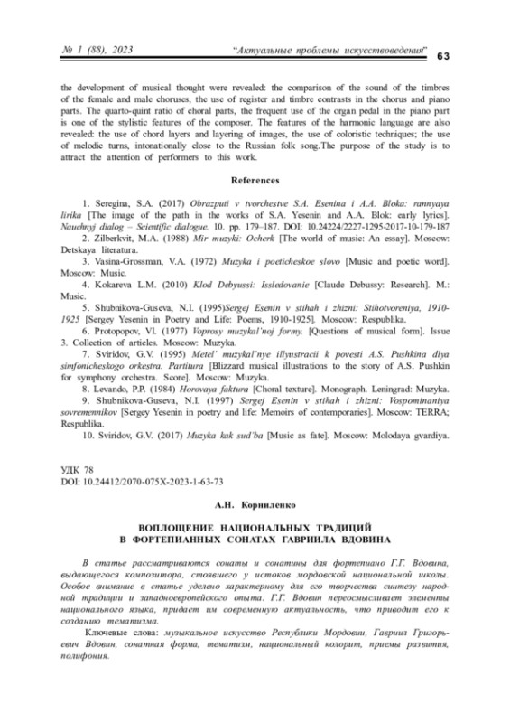 Статья: ВОПЛОЩЕНИЕ НАЦИОНАЛЬНЫХ ТРАДИЦИЙ В ФОРТЕПИАННЫХ СОНАТАХ ГАВРИИЛА ВДОВИНА (2023)