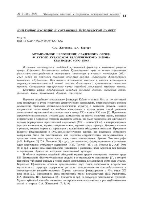7. Жиганова С.А. Кубанская свадьба как музыкально-этнографическая традиция позднего формирования: дис. … канд. искусствоведения. М.: РАМ им. Гнесиных, 2008. EDN: QDYQPP