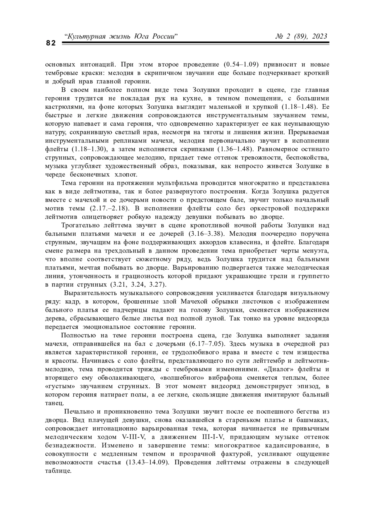 БАБЕНКО Е. В., НИСКОГУЗ Е. З. МУЗЫКА АНИМАЦИОННОГО ФИЛЬМА "ЗОЛУШКА" РЕЖИССЕРА И. АКСЕНЧУКА, КОМПОЗИТОРА И. ЦВЕТКОВА: ОСОБЕННОСТИ ТЕМАТИЗМА И ТЕМБРОВЫХ ХАРАКТЕРИСТИК ПЕРСОНАЖЕЙ // КУЛЬТУРНАЯ ЖИЗНЬ ЮГА РОССИИ. 2023. № 2 (89)