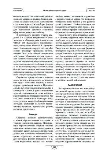 14. Талагаева Ю. А., Варушкина А. В., Калгина Е. А. Применение технологии коллективного взаимообучения на занятиях по иностранному языку в неязыковом вузе // Педагогика. Вопросы теории и практики. 2022. №7 (5). С. 496-500. EDN: AKMICV