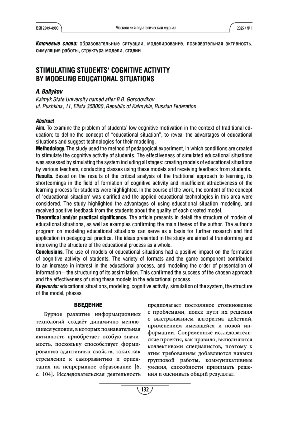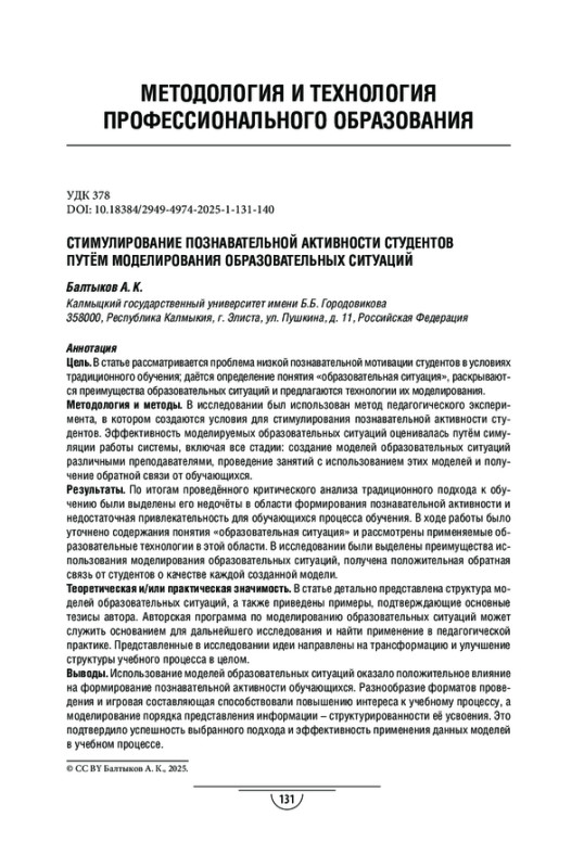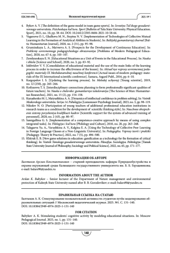 3. Балтыков А. К., Сангаджиев В. К., Абушинов Б. Б. Создание обучающего образовательного результата моделирования для самореализации студентов в учебной среде // Педагогические исследования. 2022. №4. С. 149-165. EDN: DHJWRC