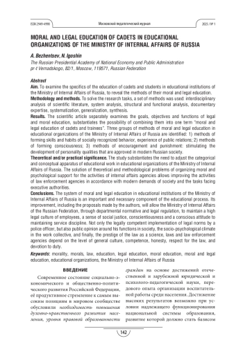 15. Никитская Е. А., Евсеева И.Г. Инновационный опыт осуществления социального воспитания в контексте профессиональной социализации курсантов и слушателей образовательных организаций МВД России // Вестник экономической безопасности. 2023. №2. С. 260-266. EDN: XHAGZJ