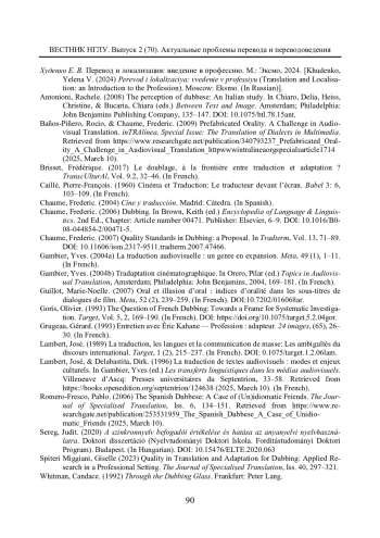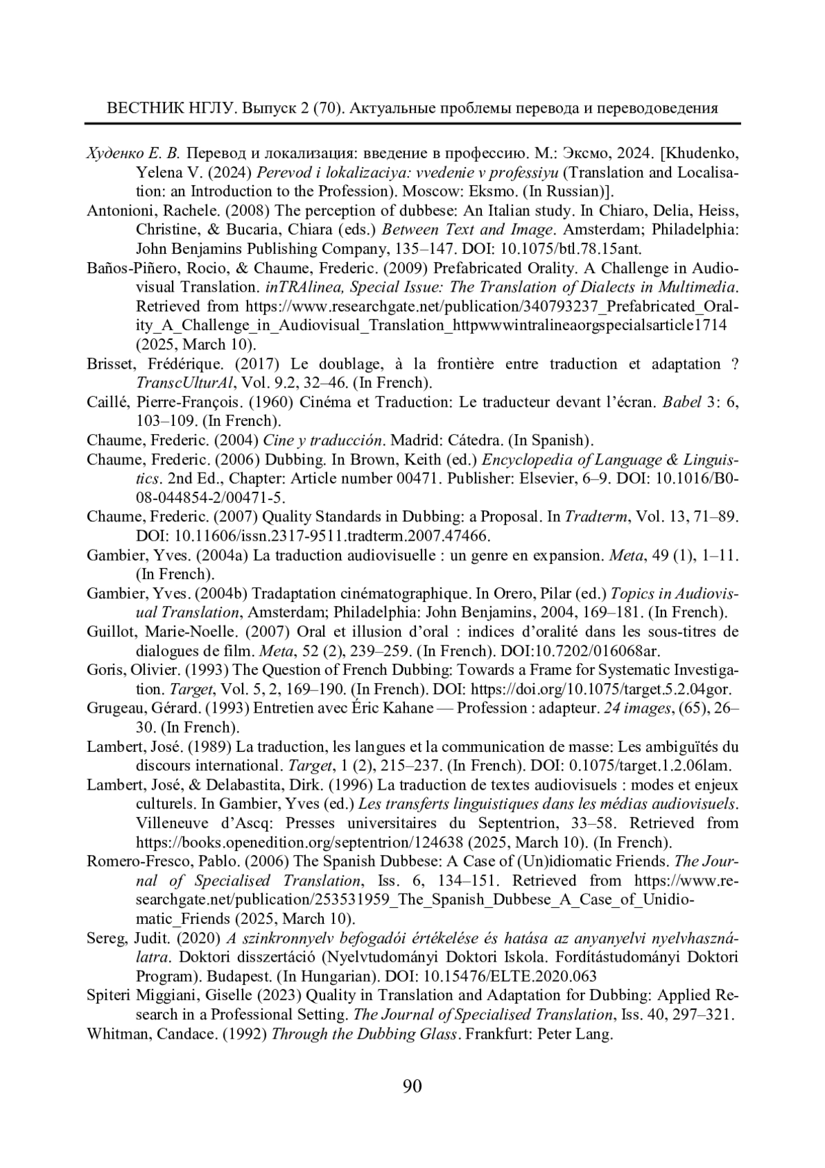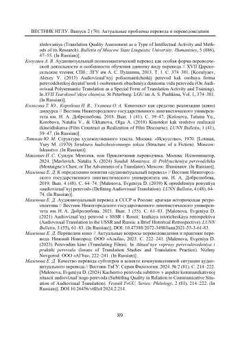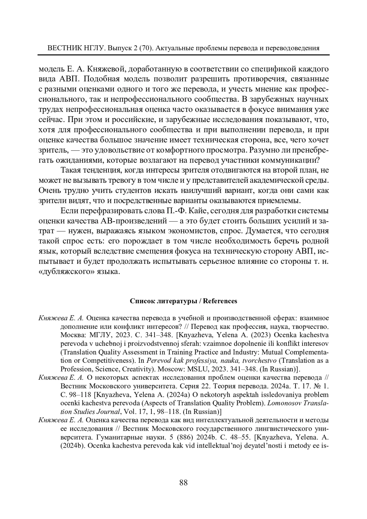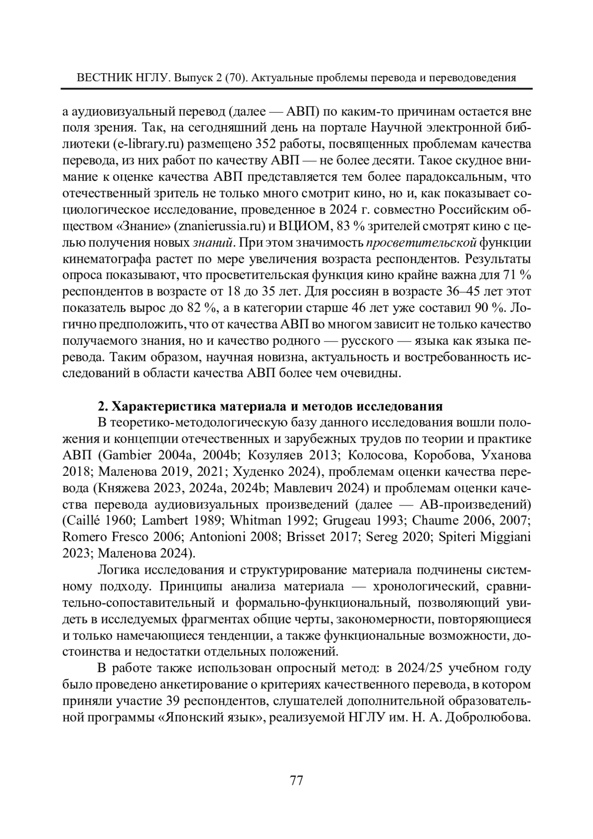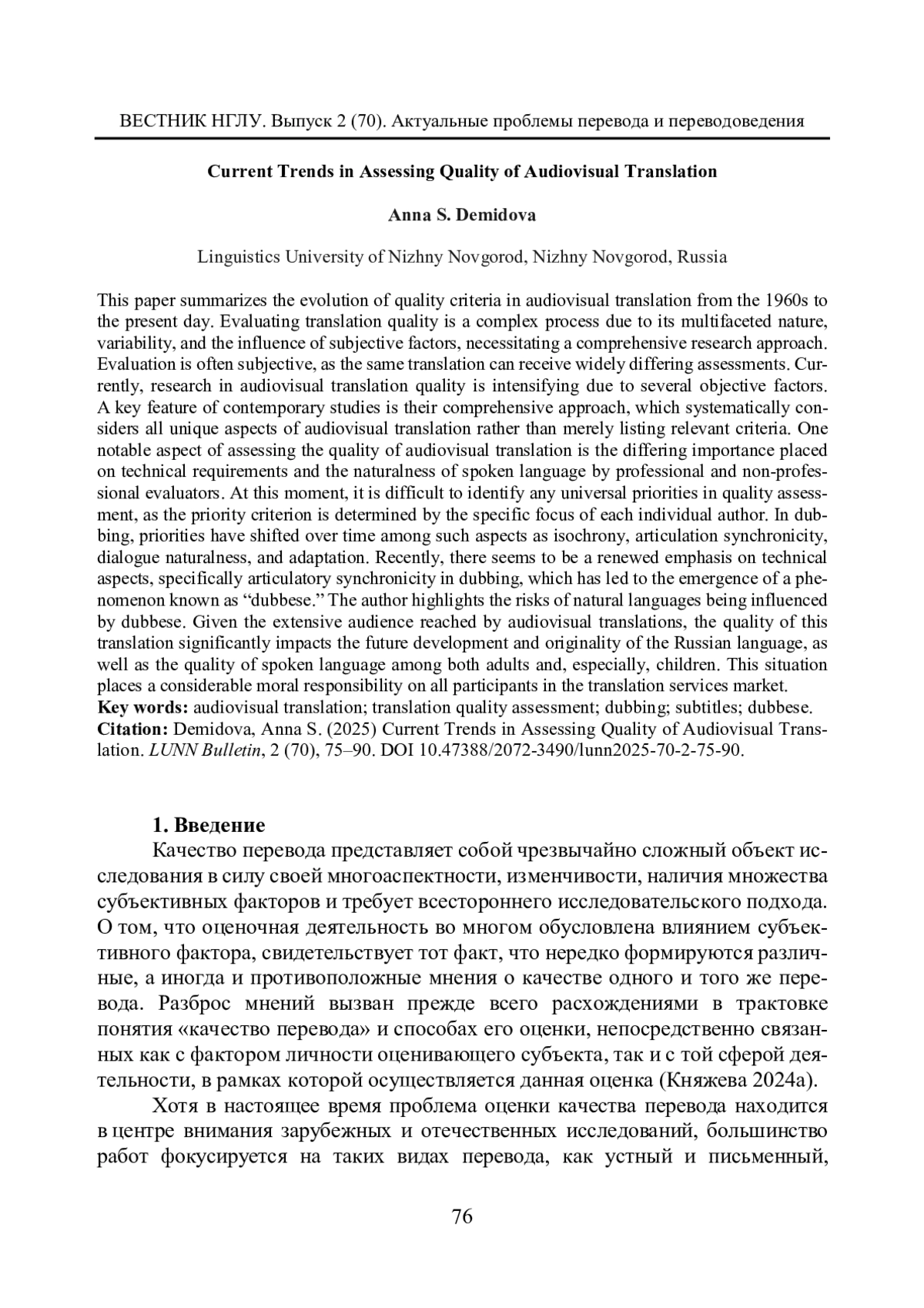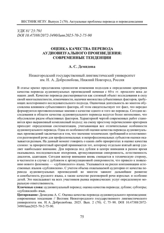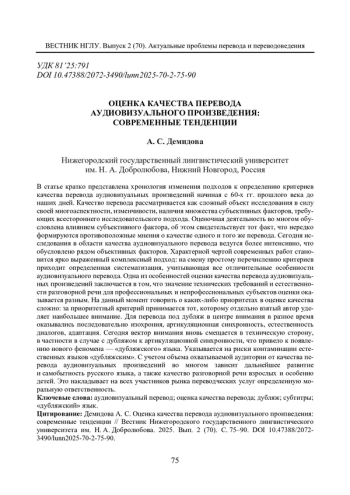 ДЕМИДОВА А. С. ОЦЕНКА КАЧЕСТВА ПЕРЕВОДА АУДИОВИЗУАЛЬНОГО ПРОИЗВЕДЕНИЯ: СОВРЕМЕННЫЕ ТЕНДЕНЦИИ // ВЕСТНИК НИЖЕГОРОДСКОГО ГОСУДАРСТВЕННОГО ЛИНГВИСТИЧЕСКОГО УНИВЕРСИТЕТА ИМ. Н. А. ДОБРОЛЮБОВА. 2025. № 2 (70)
