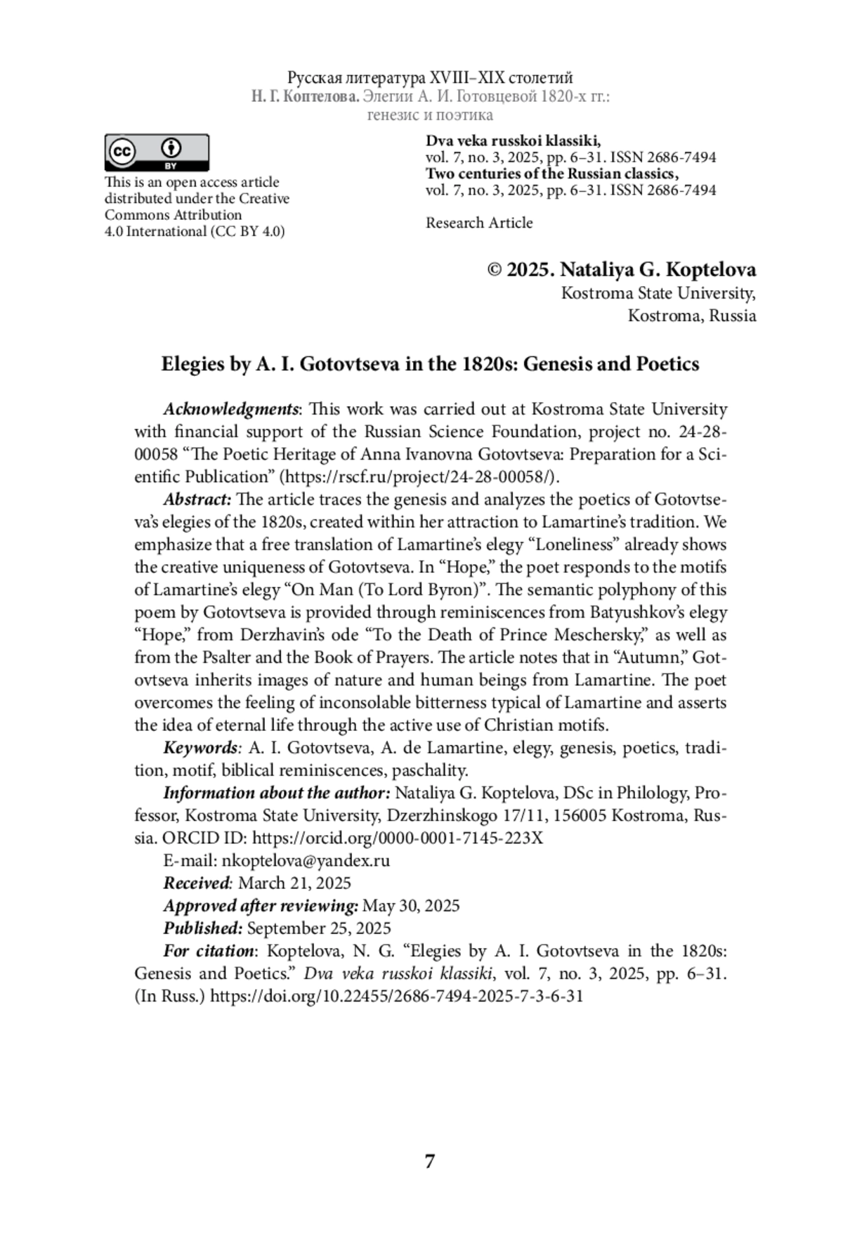 23. Коптелова Н. Г. А. И. Готовцева и П. А. Вяземский: история творческих взаимоотношений // Филологические науки: Научные доклады высшей школы. 2024. № 6. С. 65-73.