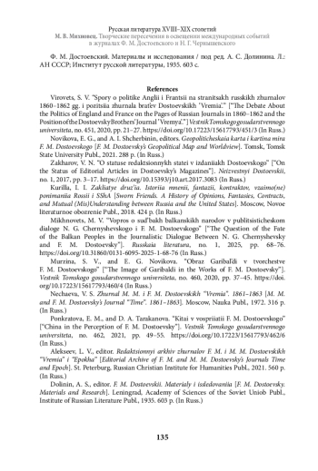 4. Вировец С. В. Споры о политике Англии и Франции на страницах русских журналов 1860-1862 гг. и позиция журнала братьев Достоевских “Время” // Вестник Томского государственного университета. 2020. № 451. С. 21-27. DOI: 10.17223/15617793/451/3