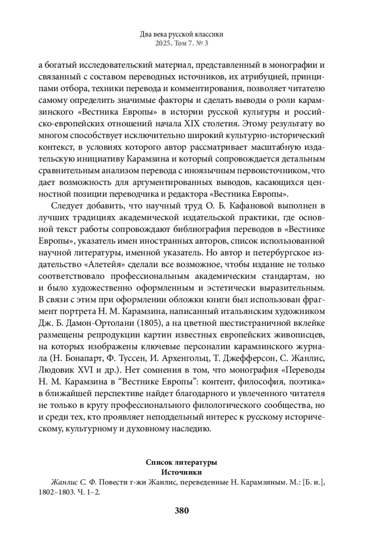 7. Кафанова О. Б. Переводы Н. М. Карамзина в “Вестнике Европы”: контент, философия, поэтика. СПб.: Алетейя, 2024. 504 с.