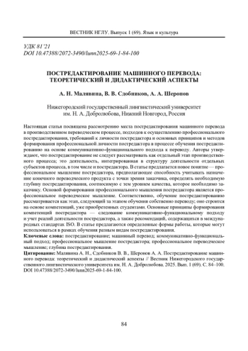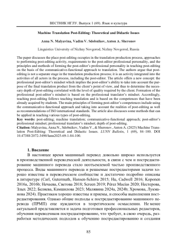 7. Малявина А. Н. Постредактирование: некоторые теоретические вопросы // Новейшая филология: современные парадигмы исследований: Сборник тезисов участников Всероссийской научно-практической конференции, посвященной памяти проф. Г. Г. Галич. Омск: ОмГУ, 2024а. С. 126-128. [Malyavina, Anna N. (2024a) Postredaktirovanie: nekotorye teoreticheskie voprosy (Post-editing: Some Theoretical Concerns). In Novejshaja filologija: sovremennye paradigmy issledovanij: Sbornik tezisov uchastnikov Vserossijskoj nauchno-prakticheskoj konferencii, posvyashchennoj pamyati prof. G. G. Galich (Modern Philology: Modern Paradigms of Research: Collection of Abstracts of Participants of the All-Russian Scientific and Practical Conference Dedicated to the Memory of Prof. G. G. Galich). Omsk: OmSU, 126-128. (In Russian)]. EDN: IUZGAE