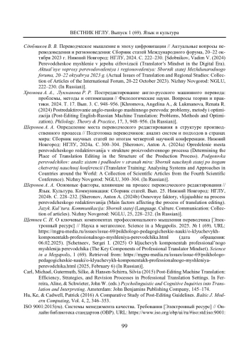 20. Шеронов А. А. Основные факторы, влияющие на процесс переводческого редактирования // Язык. Культура. Коммуникация: Сборник статей. Вып. 25. Нижний Новгород: НГЛУ, 2024b. С. 228-232. [Sheronov, Anton A. (2024b) Osnovnye faktory, vlijajushhie na process perevodcheskogo redaktirovanija (Main factors affecting the process of translation editing). Jazyk. Kul’tura. Kommunikacija: Sbornik statej (Language. Culture. Communication: Collection of articles). Nizhny Novgorod: NGLU, 25, 228-232. (In Russian)].