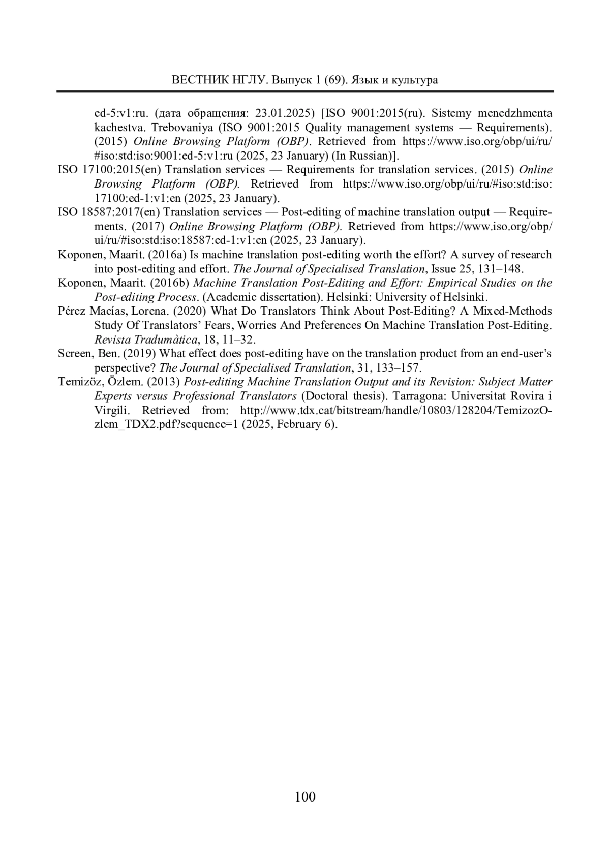 25. ISO 17100:2015(en) Translation services - Requirements for translation services. (2015) Online Browsing Platform (OBP). Retrieved from https://www.iso.org/obp/ui/ru/#iso:std:iso:17100:ed-1:v1:en (2025, 23 January).