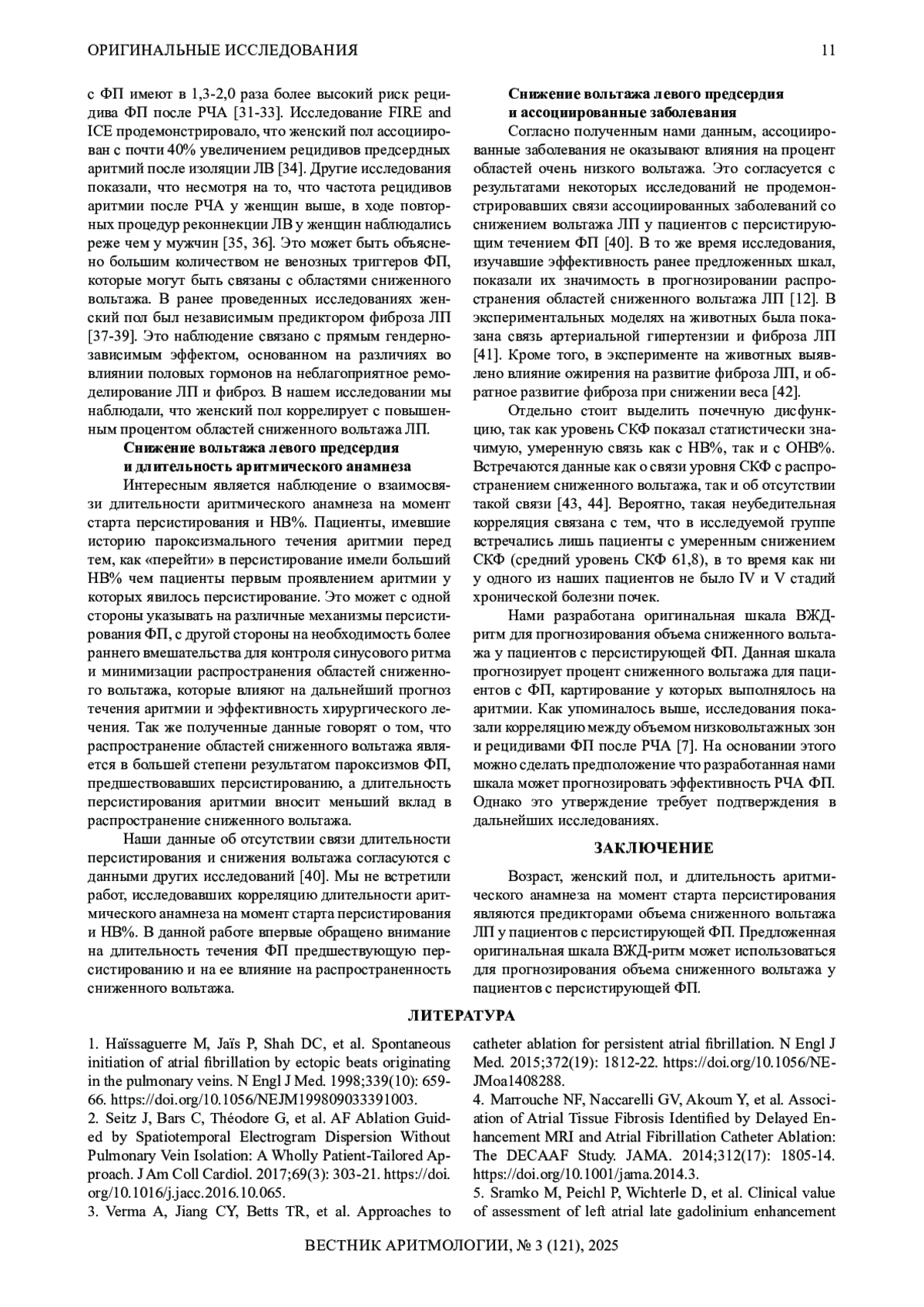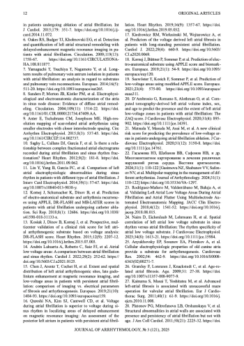 15. Chen J, Arentz T, Cochet H, et al. Extent and spatial distribution of left atrial arrhythmogenic sites, late gadolinium enhancement at magnetic resonance imaging, and low-voltage areas in patients with persistent atrial fibrillation: comparison of imaging vs. electrical parameters of fibrosis and arrhythmogenesis. Europace. 2019;21(10): 1484-93. DOI: 10.1093/europace/euz159 EDN: DSZDVT