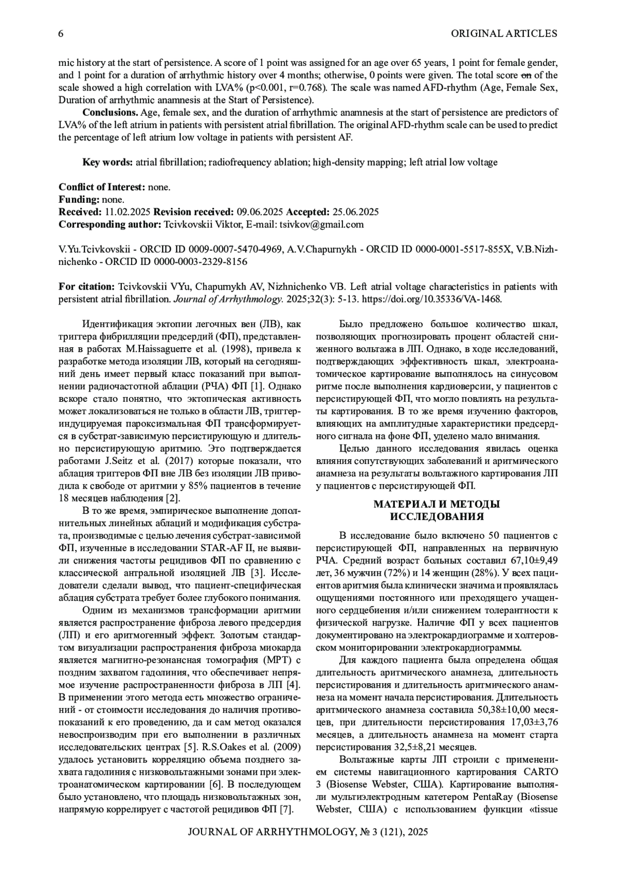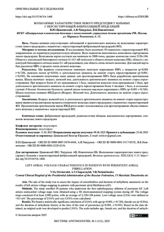 Заключение. Возраст, женский пол, и длительность аритмического анамнеза на момент старта персистирования являются предикторами процента сниженного вольтажа левого предсердия у пациентов с персистирующей ФП. Предложенная оригинальная шкала ВЖД-ритм может использоваться для прогнозирования объема сниженного вольтажа у пациентов с персистирующей ФП.