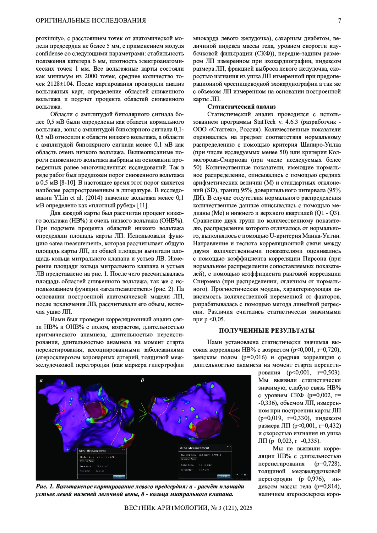 Материал и методы исследования. В исследование было включено 50 пациентов с персистирующей ФП, направленных на первичную радиочастотную аблацию. Всем пациентам выполнялось вольтажное картирование левого предсердия. Вольтажные карты состояли как минимум из 2000 точек, среднее количество точек 2128±104. Области с амплитудой биполярного сигнала 0,1-0,5 мВ относили к области низкого вольтажа (НВ), области с амплитудой биполярного сигнала менее 0,1 мВ расценивали, как область очень низкого вольтажа. Для каждой карты был рассчитан НВ% и процент очень низкого вольтажа.