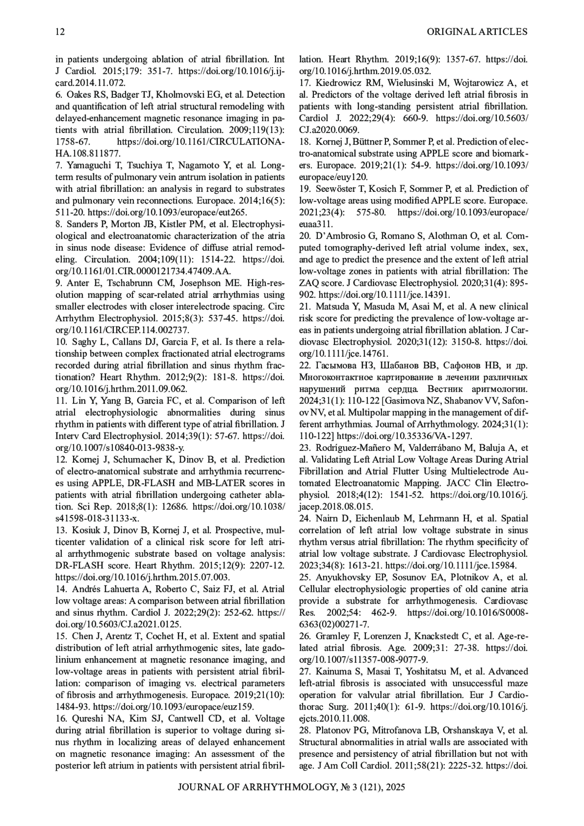 13. Kosiuk J, Dinov B, Kornej J, et al. Prospective, multicenter validation of a clinical risk score for left atrial. arrhythmogenic substrate based on voltage analysis: DR-FLASH score. Heart Rhythm. 2015;12(9): 2207-12. DOI: 10.1016/j.hrthm.2015.07.003 EDN: GSWVZN
