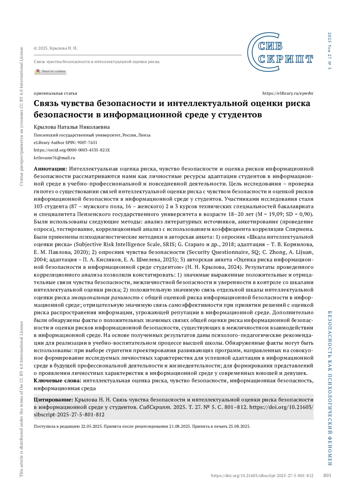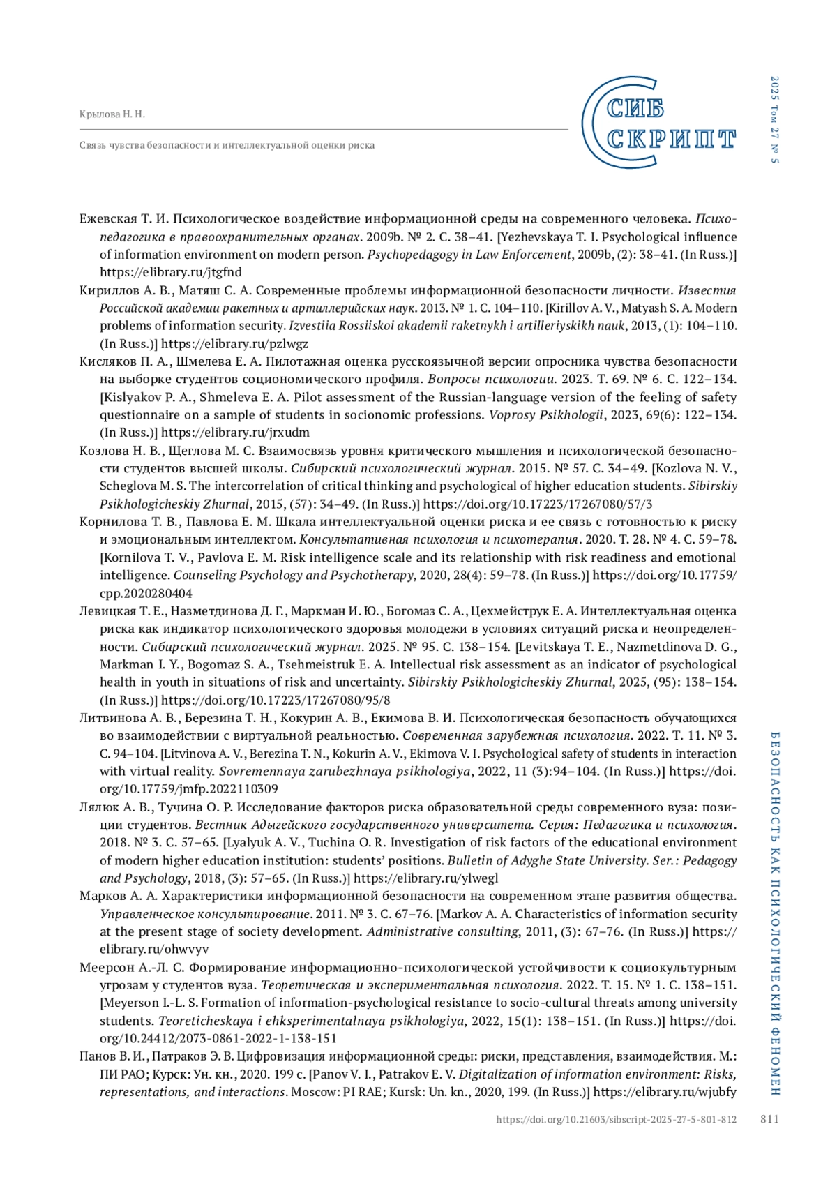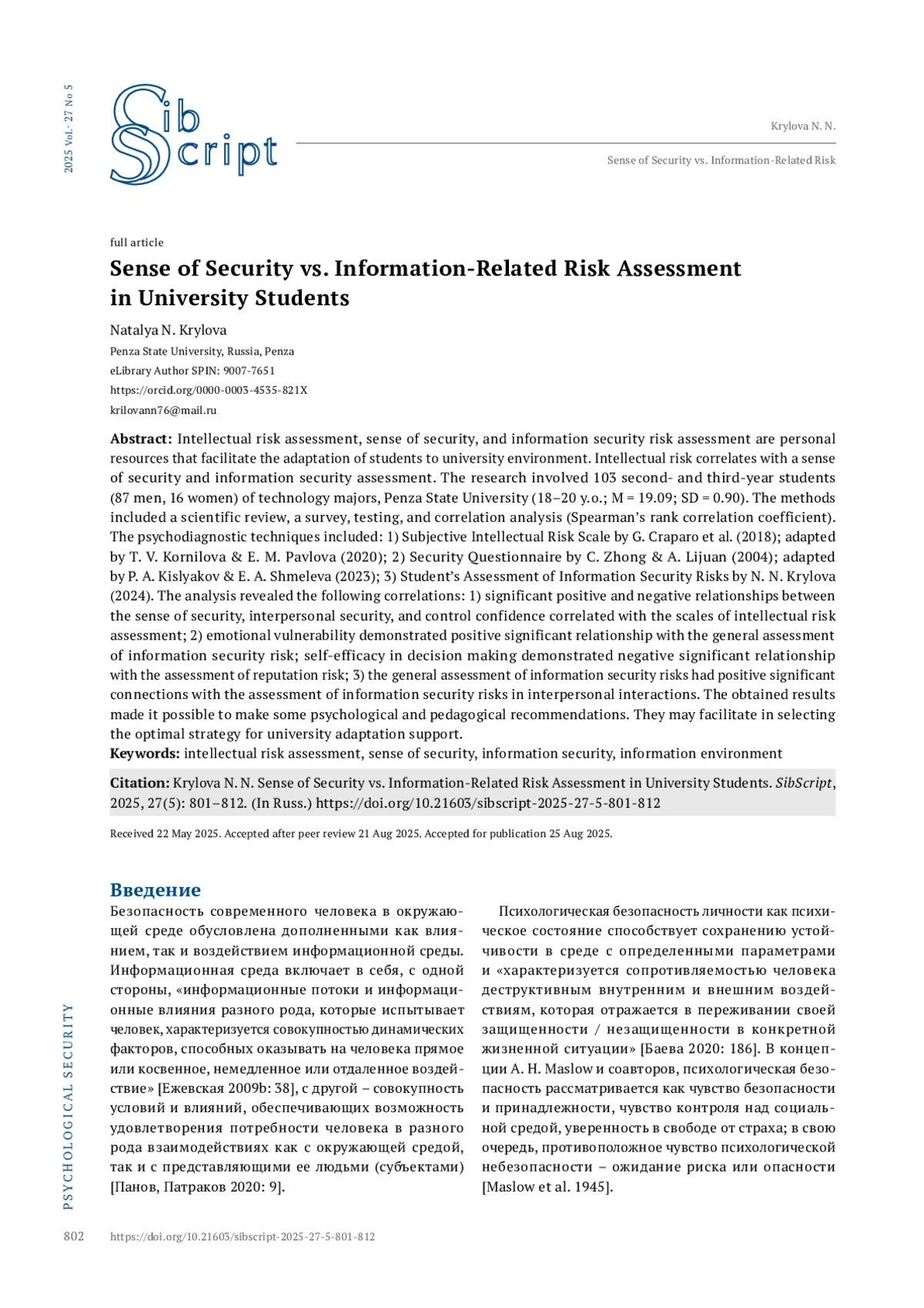 КРЫЛОВА Н. Н. СВЯЗЬ ЧУВСТВА БЕЗОПАСНОСТИ И ИНТЕЛЛЕКТУАЛЬНОЙ ОЦЕНКИ РИСКА БЕЗОПАСНОСТИ В ИНФОРМАЦИОННОЙ СРЕДЕ У СТУДЕНТОВ // СИБСКРИПТ. 2025. Т. 27, № 5